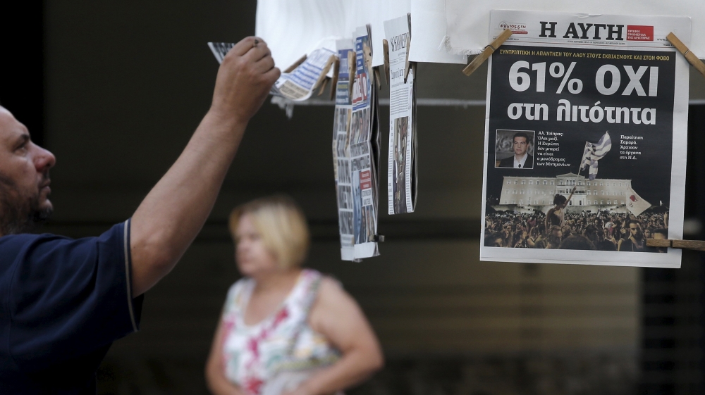 ![A man looks at newspapers showing the results of Sunday''s referendum in central Athens, Greece [REUTERS]](https://aljazeeranews-3fuh52rgrl.edgeone.app/wp-content/uploads/2015/07/4daf8eff0109488fa7b7eaa608422b03_18.jpeg?resize=770%2C513&quality=80)