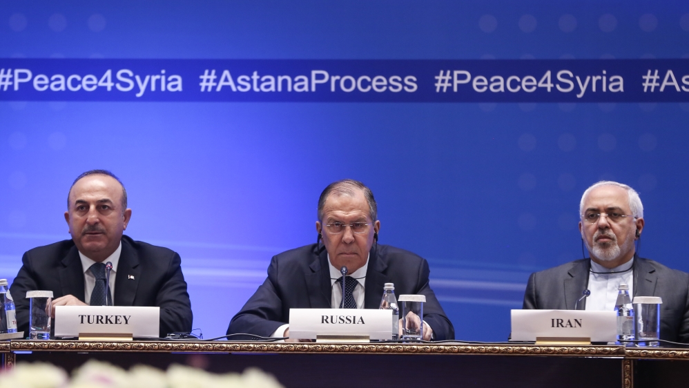 Turkish Foreign Affairs Minister Mevlut Cavusoglu (L), Russian Foreign Minister Sergey Lavrov (C) and Iranian Foreign Minister Mohammad Javad Zarif (R) hold joint press conference after the ninth round of Syria peace talks in Astana, Kazakhstan on March 16, 2018 [Anadolu]