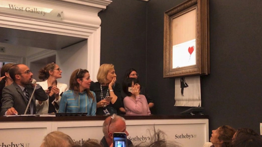 The bottom half of ‘Girl with Balloon’, one of Banksy’s most famous works, gets sucked into shredder hidden in frame.