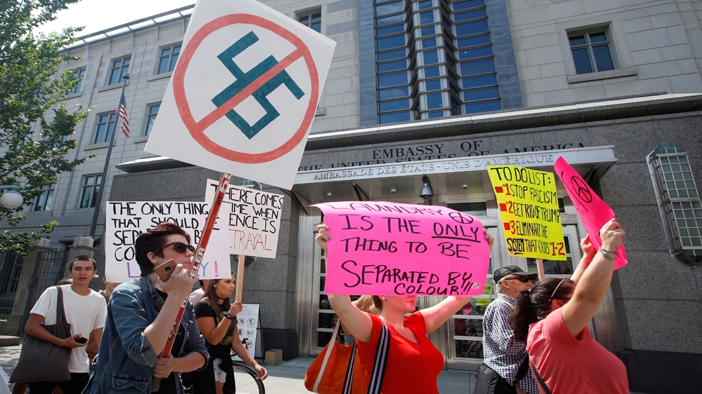 ![People take part in an anti-racism protest outside the U.S. Embassy in Ottawa, Ontario, Canada August 23, 2017. [File: Chris Wattie/Reuters]](https://aljazeeranews-3fuh52rgrl.edgeone.app/wp-content/uploads/2018/05/2397bccce5ce4c2bba9acdfe0f2f672d_18.jpeg?resize=770%2C513&quality=80)