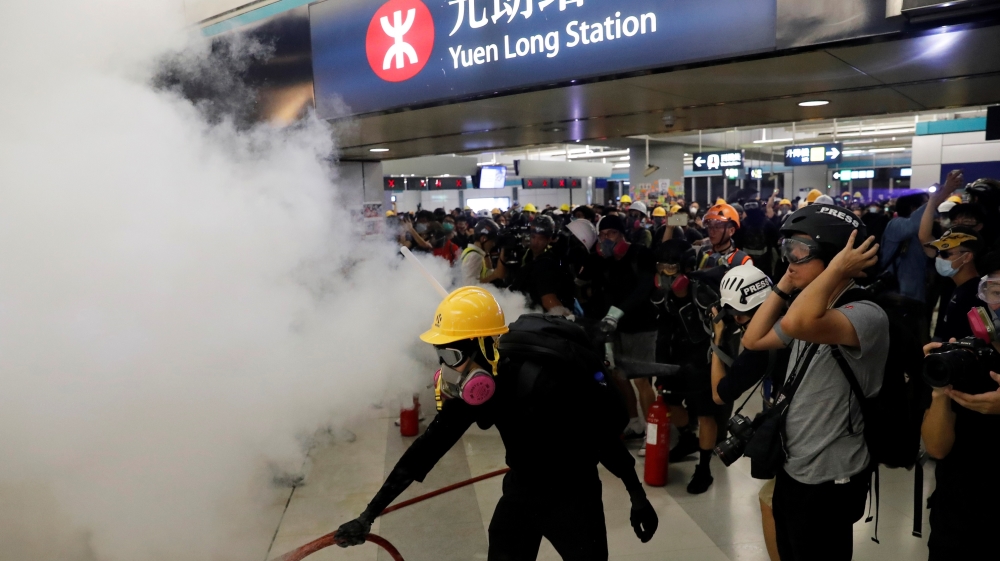 Police with riot shields faced off at the station entrance against a group of remaining protesters, who sprayed a firehose and spread soap on the floor to slow a police approach, while piling up rubbish bins, a wheelchair and umbrellas in a makeshift blockade.