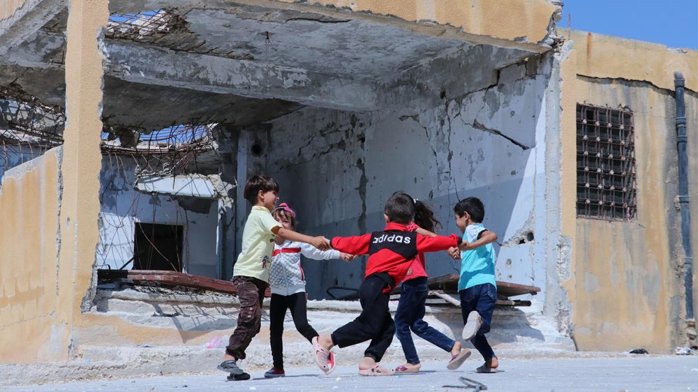 Children playing outside their school, Idlib Syria