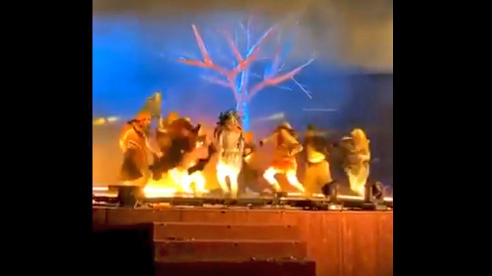 A video tweeted by Al Ekhbariya appeared to show a man in street clothes rushing onto the stage towards a group of costumed performers and then falling to the ground as someone else chased him.
