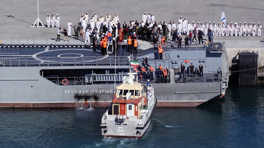 State television showed what it said was a Russian warship arriving at Chabahar port in southern Iran and said the Chinese will join shortly, calling the three countries “the new triangle of power in the sea”.
