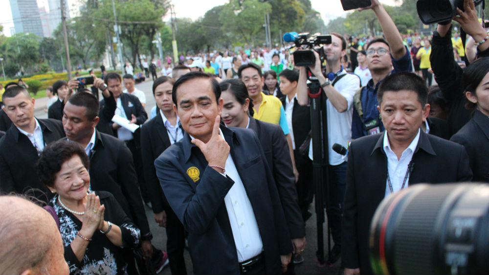 Bangkok, Thailand – An aerobics class is under way as a sober-suited Prime Minister Prayuth Chan-ocha walks briskly into central Lumphini Park, accompanied by city officials and a pack of journalists.