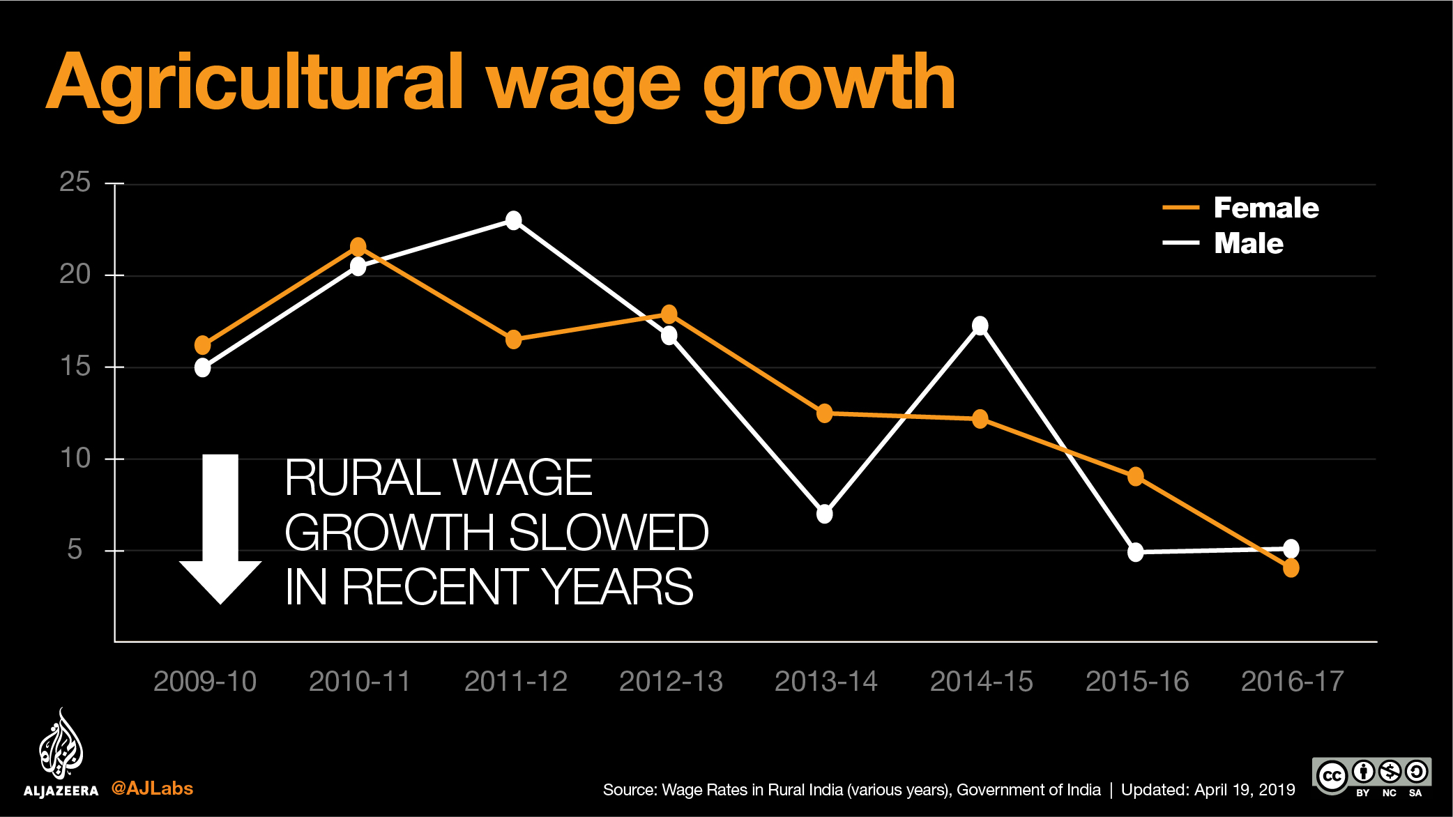 The growth in rural wages for men and women in agriculture, in real terms, also declined in recent years.