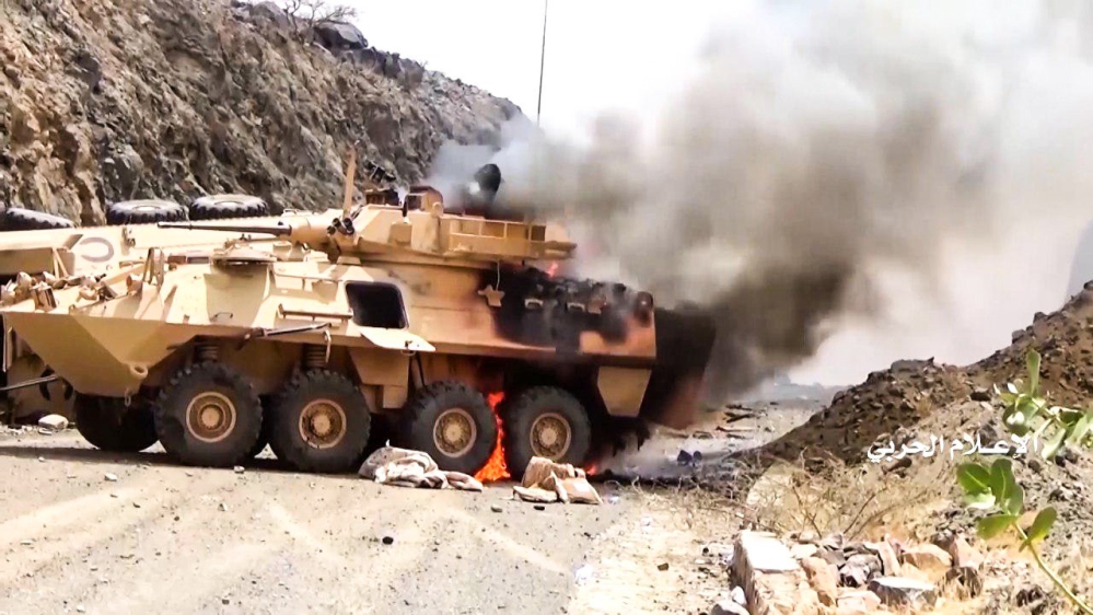 The video showed armoured vehicles, some ablaze, with stencilled Saudi markings, along with large piles of weapons and ammunition the rebels say they seized.