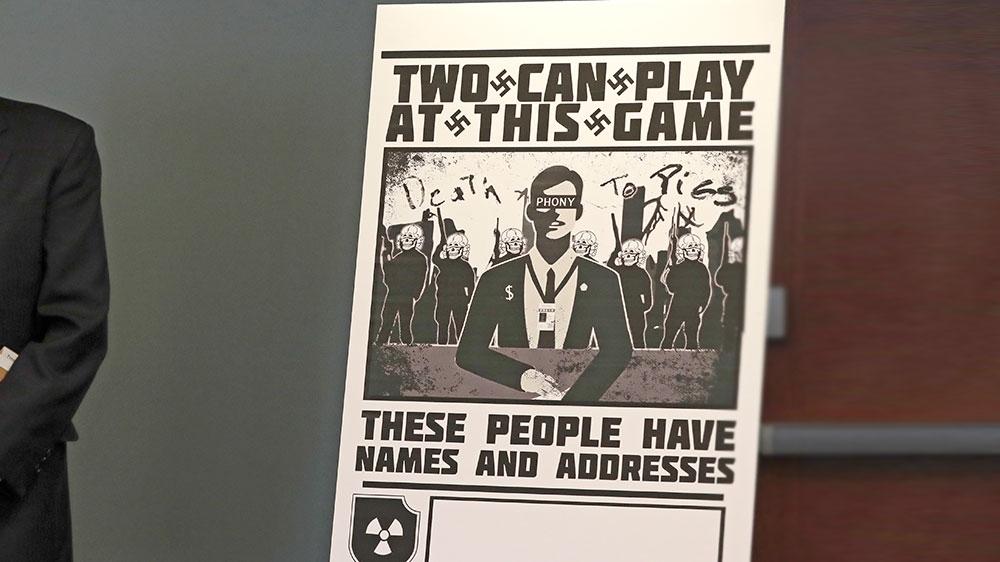 In Seattle, prosecutors announced charges against a group of alleged Atomwaffen members for cyberstalking and mailing threatening communications in a campaign against journalists with Swastika-laden posters telling them “You have been visited by your local Nazis.”