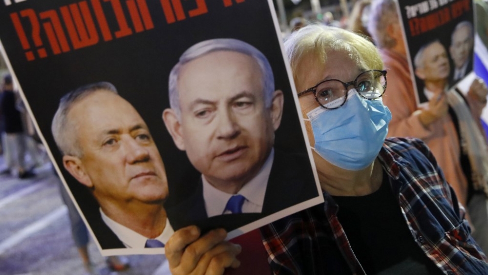 Protesters are upset that Netanyahu’s power-sharing deal with Gantz leaves the prime minister in power as he prepares to go on trial for corruption charges.