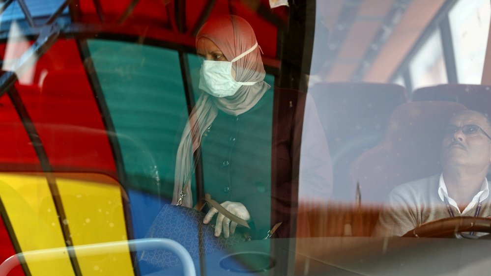 A Palestinian woman, wearing a mask as a preventive measure against coronavirus, alights from a bus upon her return from abroad, at the Israeli-controlled King Hussein/Allenby Bridge crossing in Jericho in the Israeli-occupied West Bank [File: Ammar Awad/Reuters]