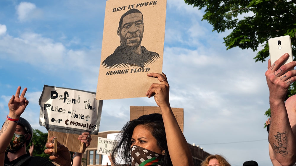 A man holds a sign while protesting near the area where George Floyd was pinned to the ground by police [Kerem Yucel/AFP]