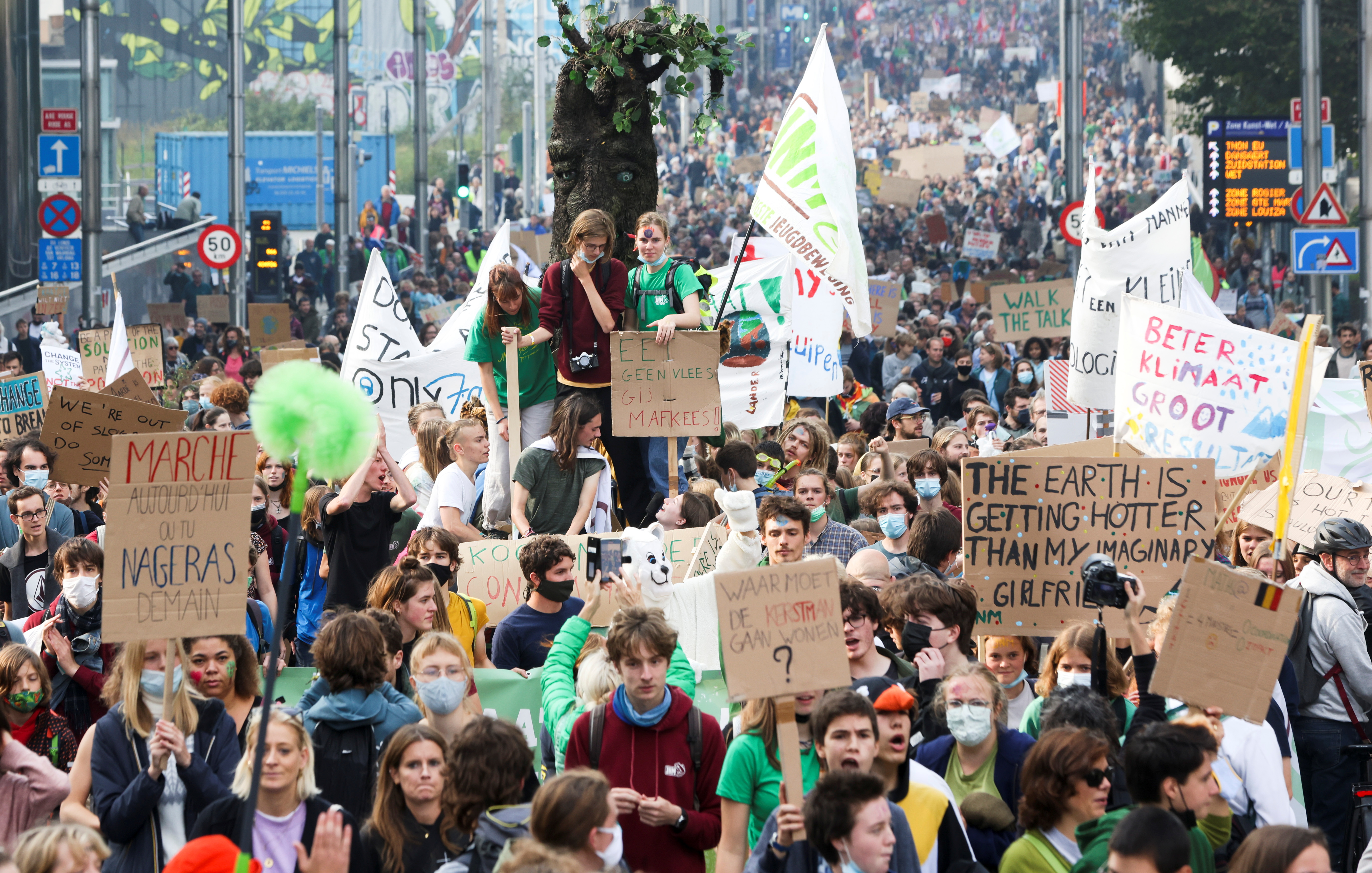 “Politicians die of old age, Rosa died of climate change,” said one banner referring to a 15-year-old who was swept away by Belgium’s Ourthe River in July, when Europe was battered by days of torrential rain and floods.