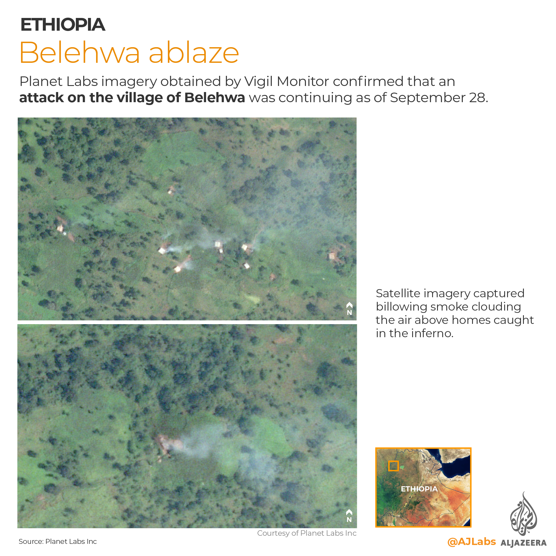Planet Labs imagery obtained by Vigil Monitor confirmed that an attack on the village of Belehwa was ongoing as of September 28. Satellite imagery captured the billowing smoke clouding the air above homes caught in the inferno.
