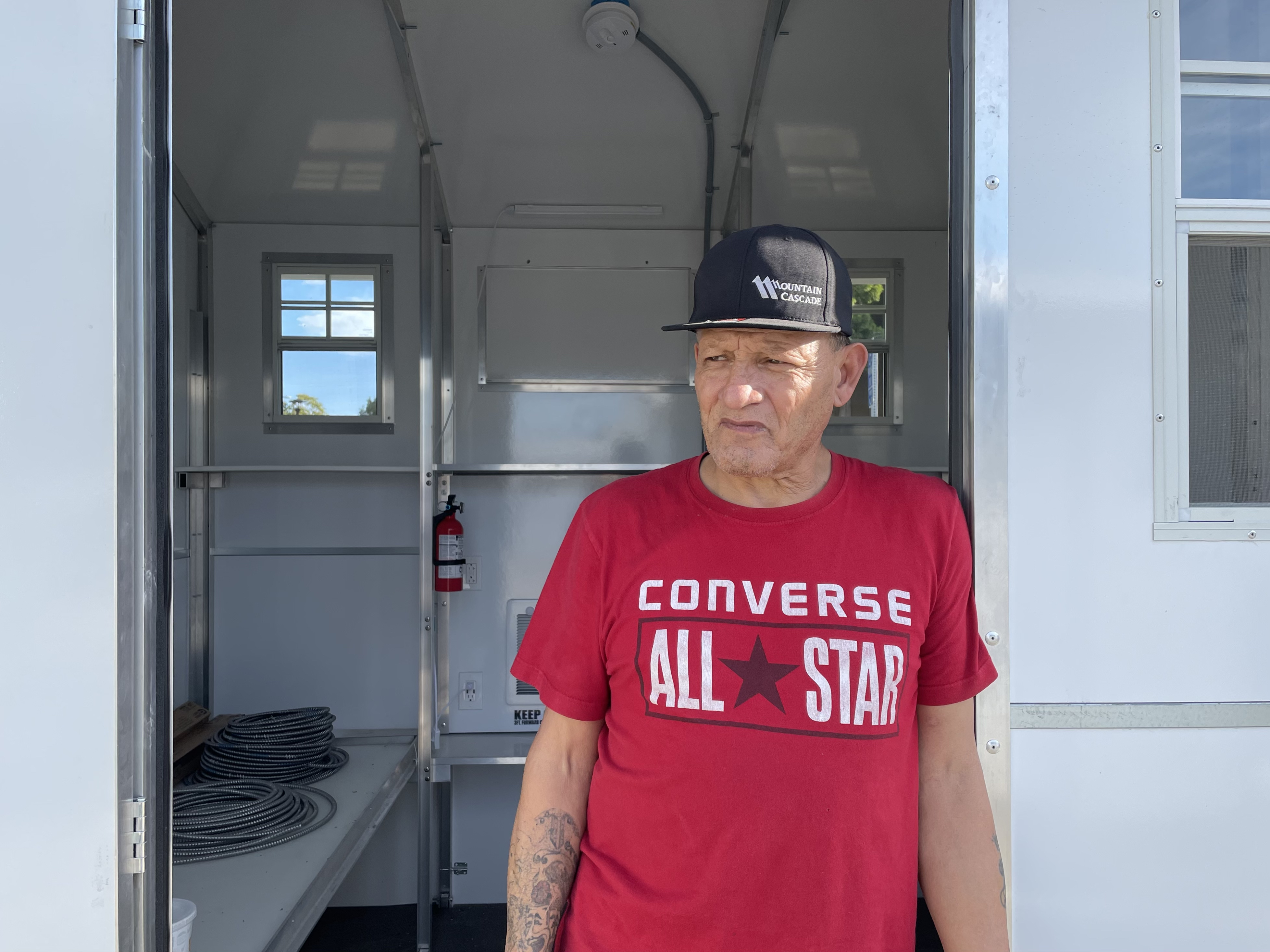 Surrounding Ybarra are 16 white, prefabricated tiny homes, purchased by the city for about $8,000 each. After living without a house for 15 years, and most recently in a tent, Ybarra is now moving into his new temporary home with a bed, electricity, heat, carbon monoxide monitor, fire alarm, fire extinguisher, and lock and key. He also has access to drinking water and a shower.