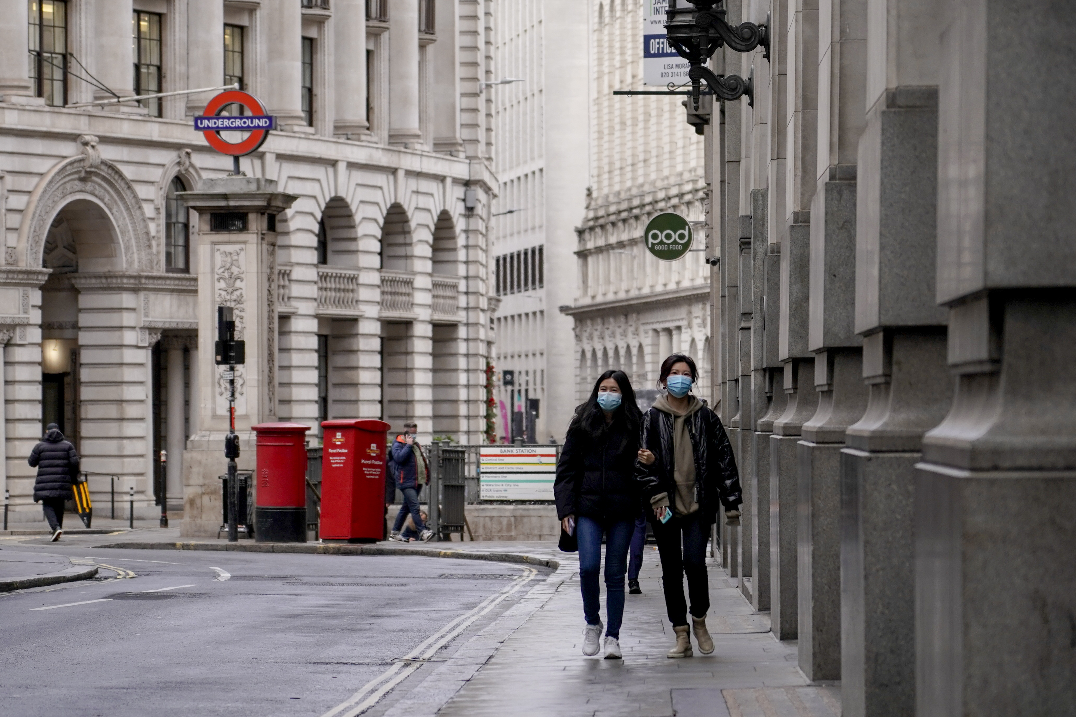 People wear face masks while walking in an empty street in London [Alberto Pezzali/AP Photo]