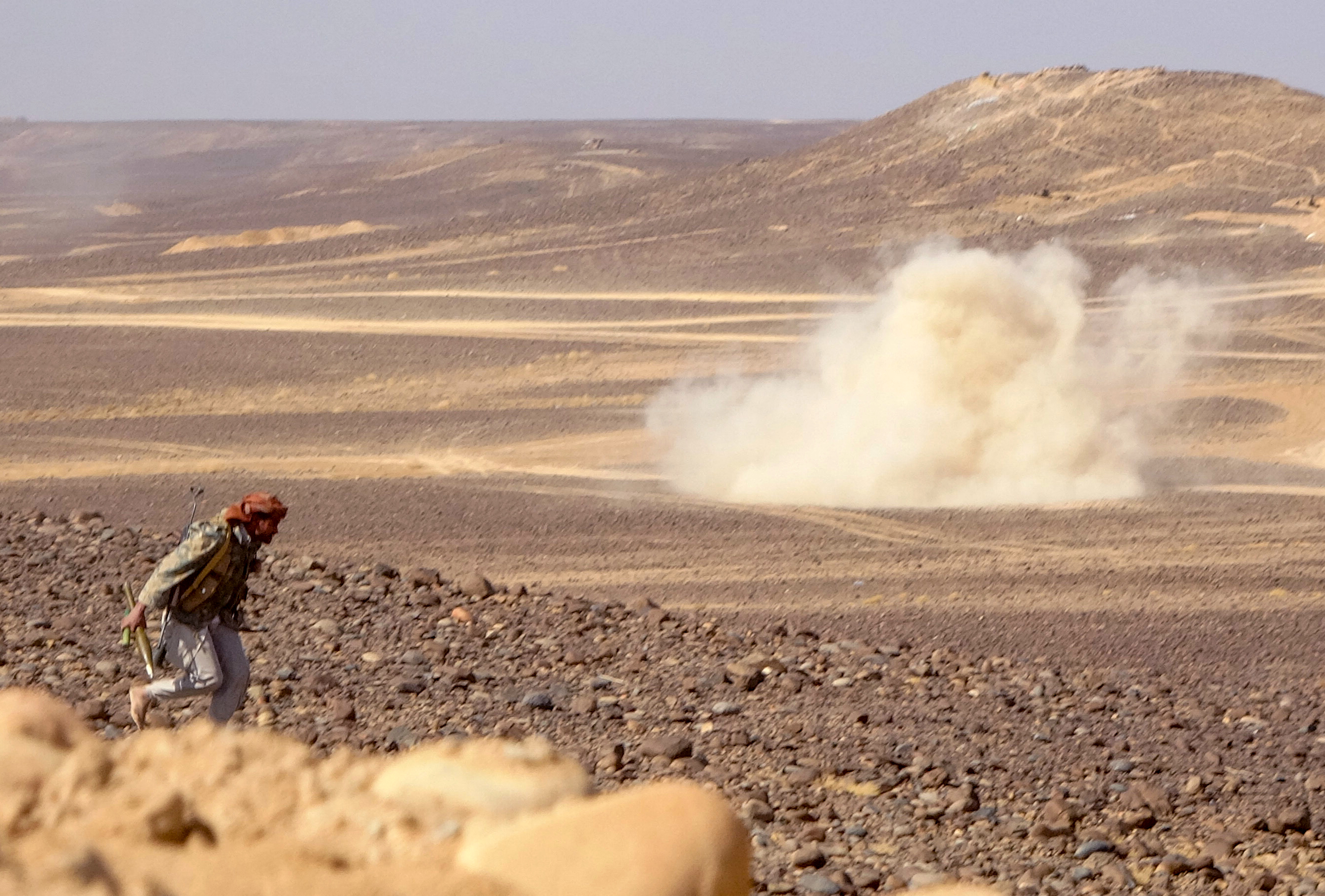 Smoke billows during clashes between forces loyal to Yemen's Saudi-backed government and Houthi rebel fighters in al-Jadaan, northwest of Marib in central Yemen [AFP]