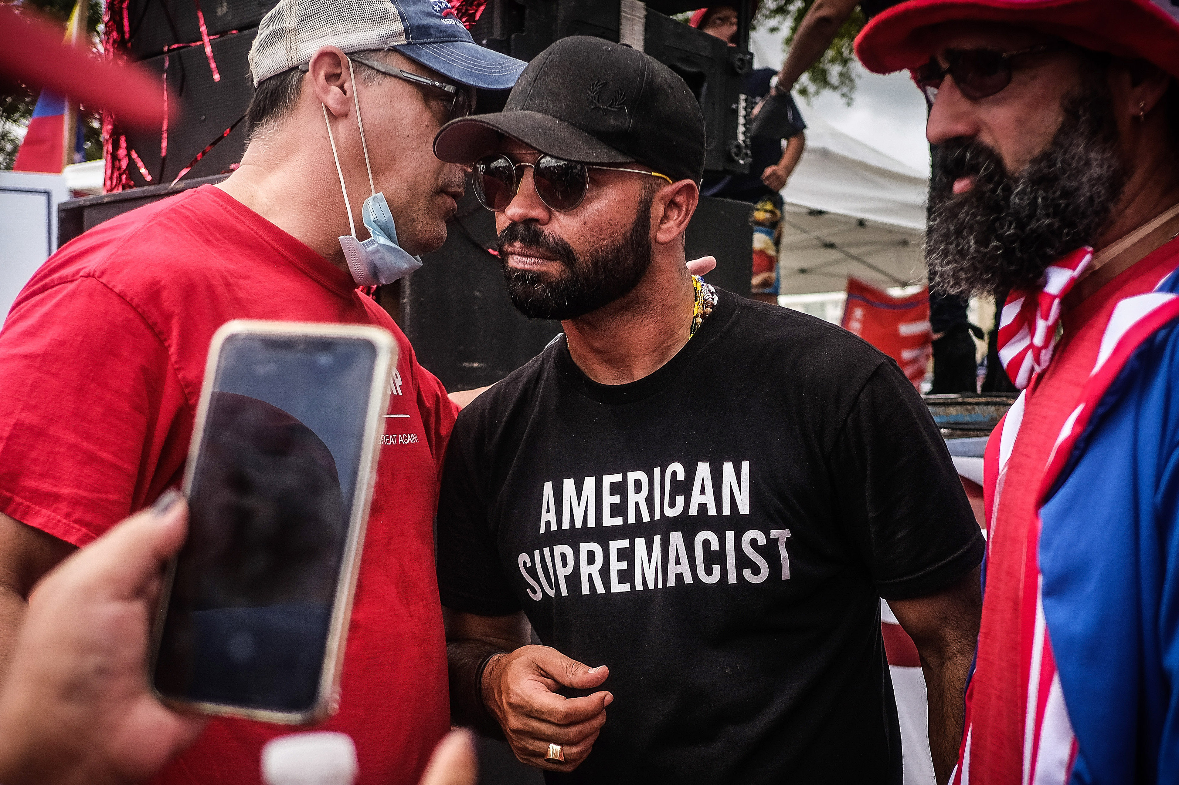 Far-right group the Proud Boys leader Enrique Tarrio interacts with supporters during the ‘Latinos for Trump’ demonstration, at Tamiami Park in Miami, Florida, on October 18, 2020 [File: Mario Cruz/EPA-EFE]