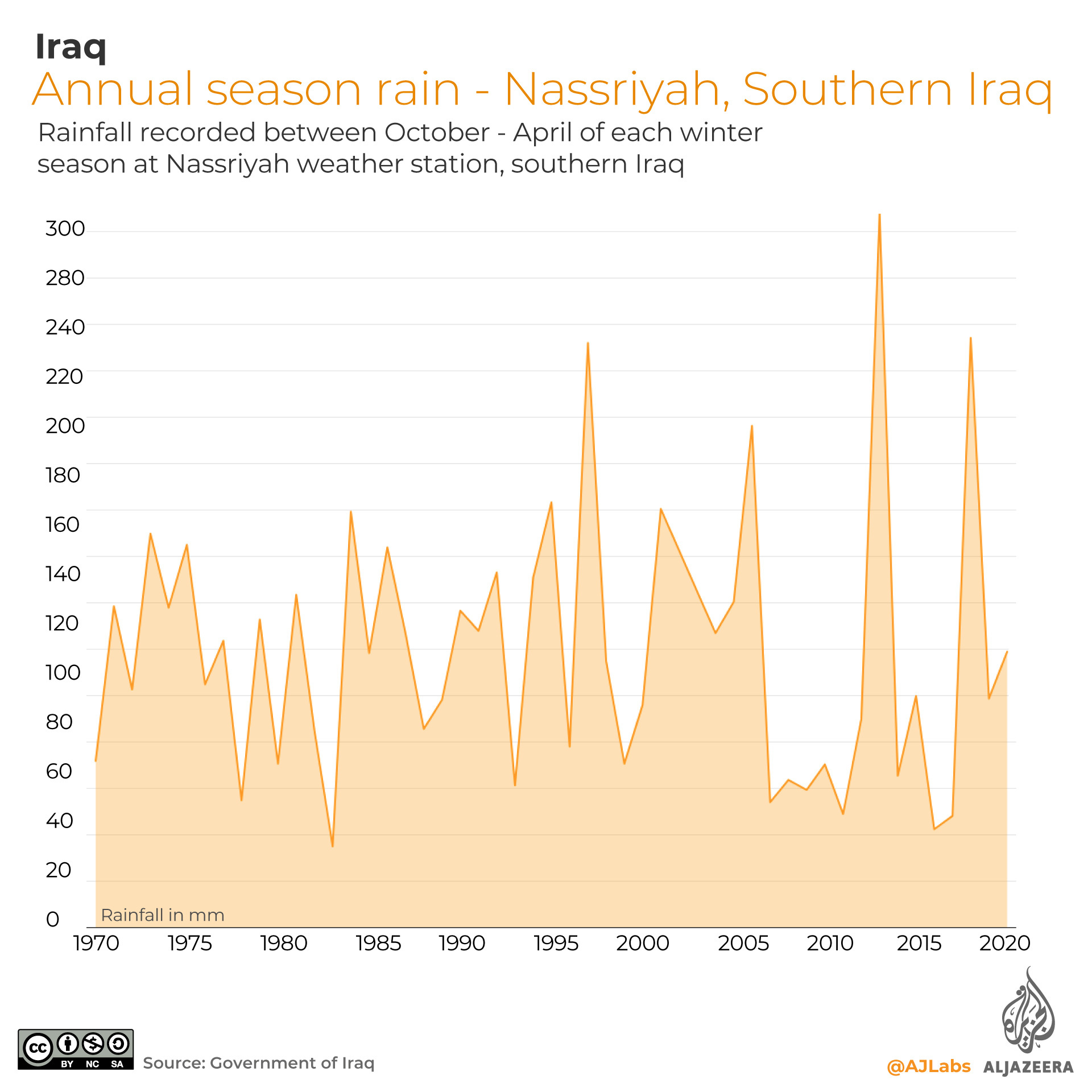Data obtained from the Iraqi government showed that average yearly rainfall has become more erratic in this area since the 1970s, and that average annual rainfall for the last twenty years was 10 percent lower than in the three decades prior.
