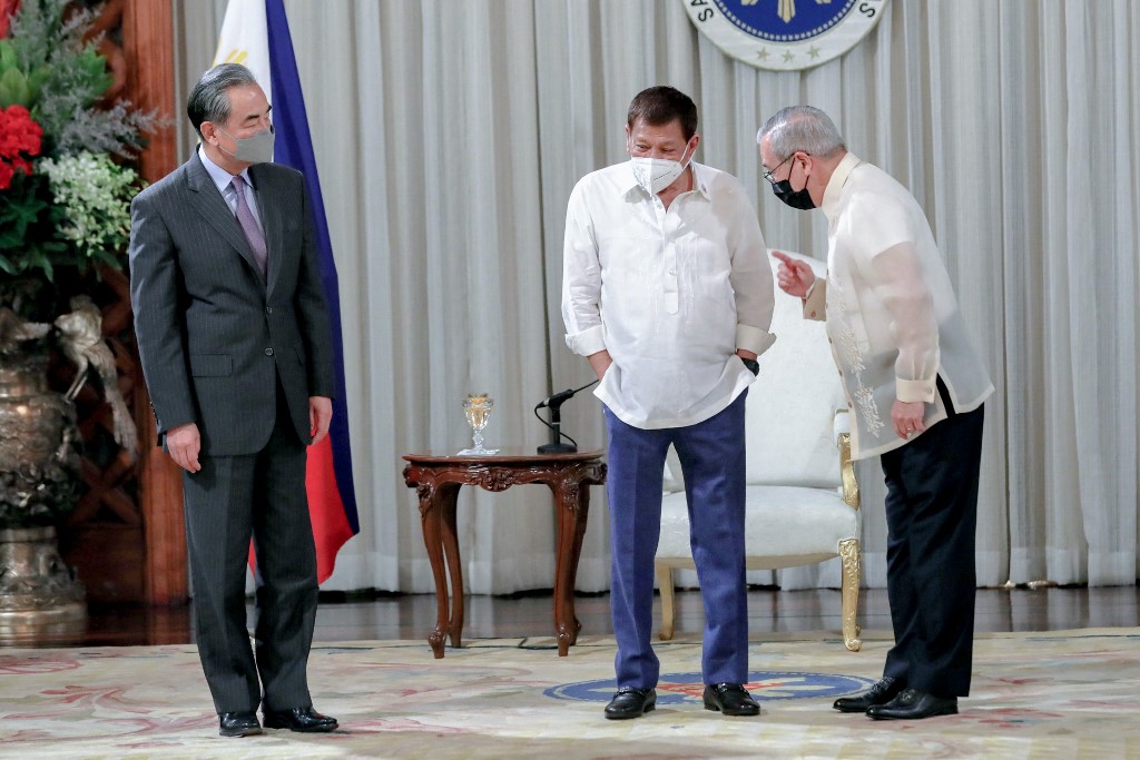 Philippine President Rodrigo Duterte (centre) listens to Philippine Foreign Secretary Teodoro Locsin (right) as they welcome China's Foreign Minister Wang Yi (left) during a courtesy call at the Malacanang presidential palace in Manila last January [File: Richard Madelo/Handout Photo via AFP]