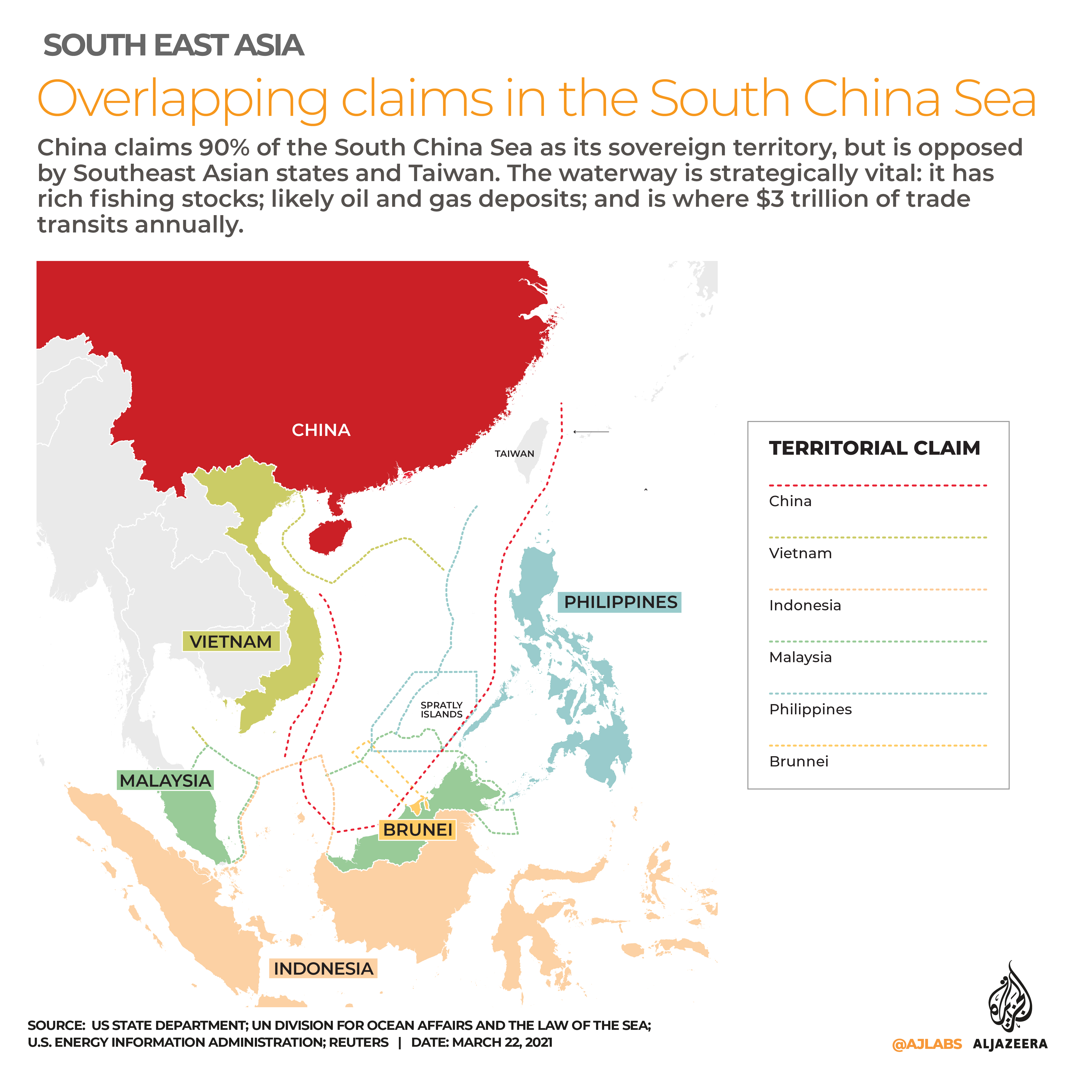 Malaysia, the Philippines, Taiwan, Vietnam and Brunei also lay claim to parts of the sea, which has vast oil and gas potential.