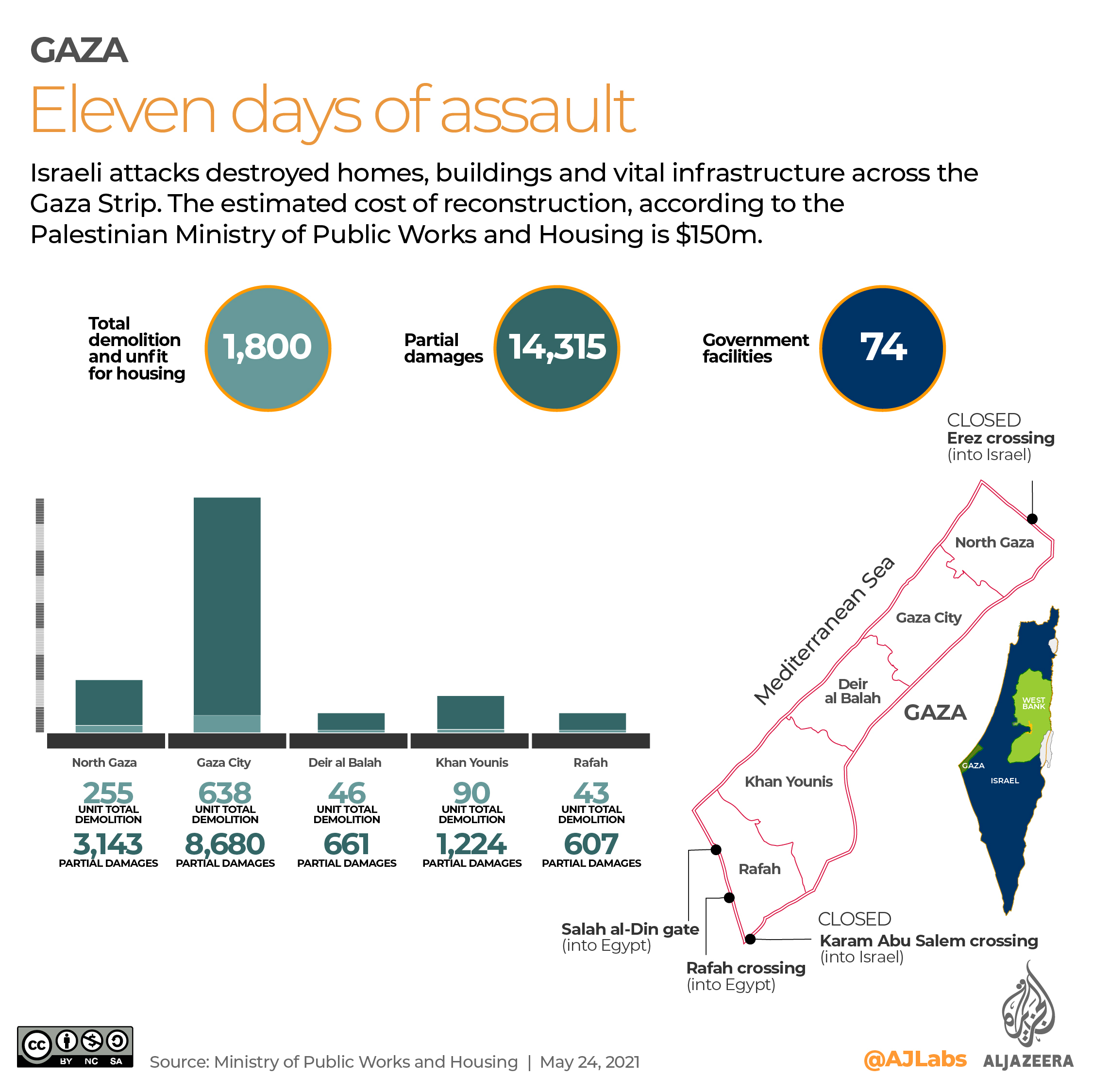Some 74 public buildings, including local municipalities, were also destroyed, according to figures released by the information ministry run by Hamas, the group that governs the Gaza Strip.