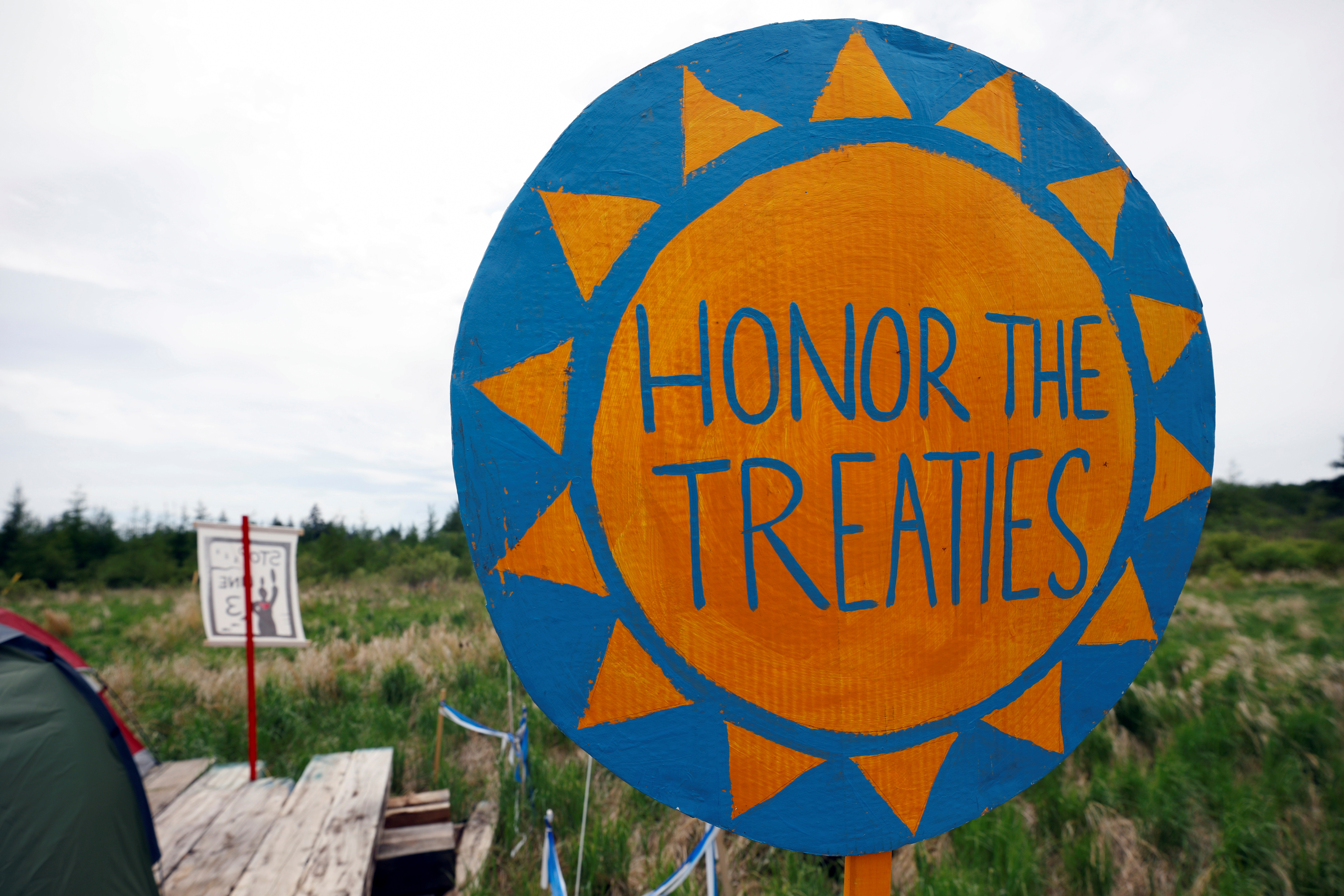 On June 7, the same day as the march, about 200 people set up tents on platforms the company built to allow heavy machinery to roll over the marshy land, in an effort to prevent construction.