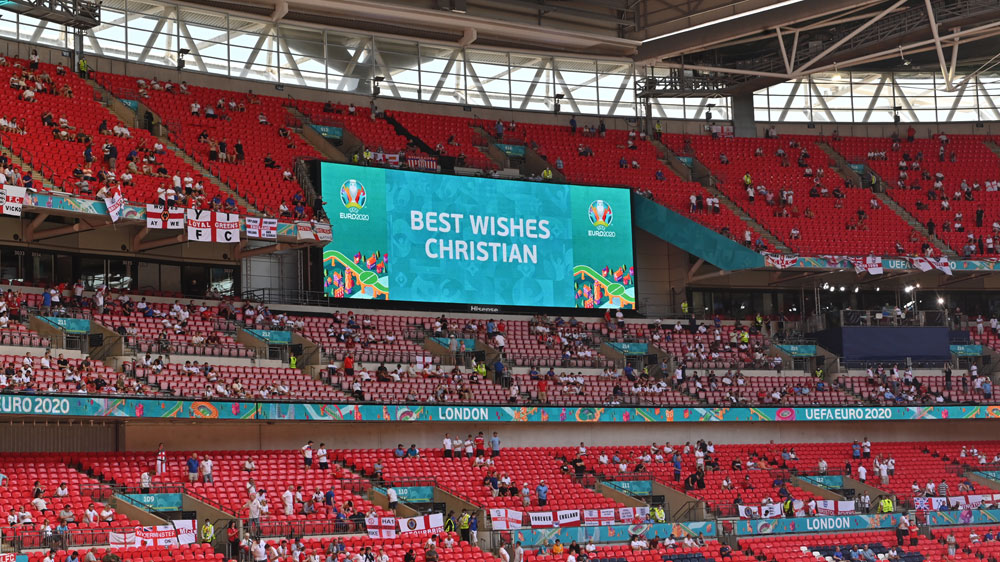 ![A screen sends Best Wishes to Danish national soccer player Christian Eriksen before the UEFA EURO 2020 group D preliminary round soccer match between England and Croatia in London, Britain, 13 June 2021. Eriksen collapsed on the pitch during the UEFA EURO 2020 match between Denmark and Finland on 12 June 2021 and received medical treatment before being stretchered off to a hospital [EPA-EFE/Justin Tallis]](https://aljazeeranews-3fuh52rgrl.edgeone.app/wp-content/uploads/2021/06/1000-4.jpg?resize=770%2C513&quality=80)