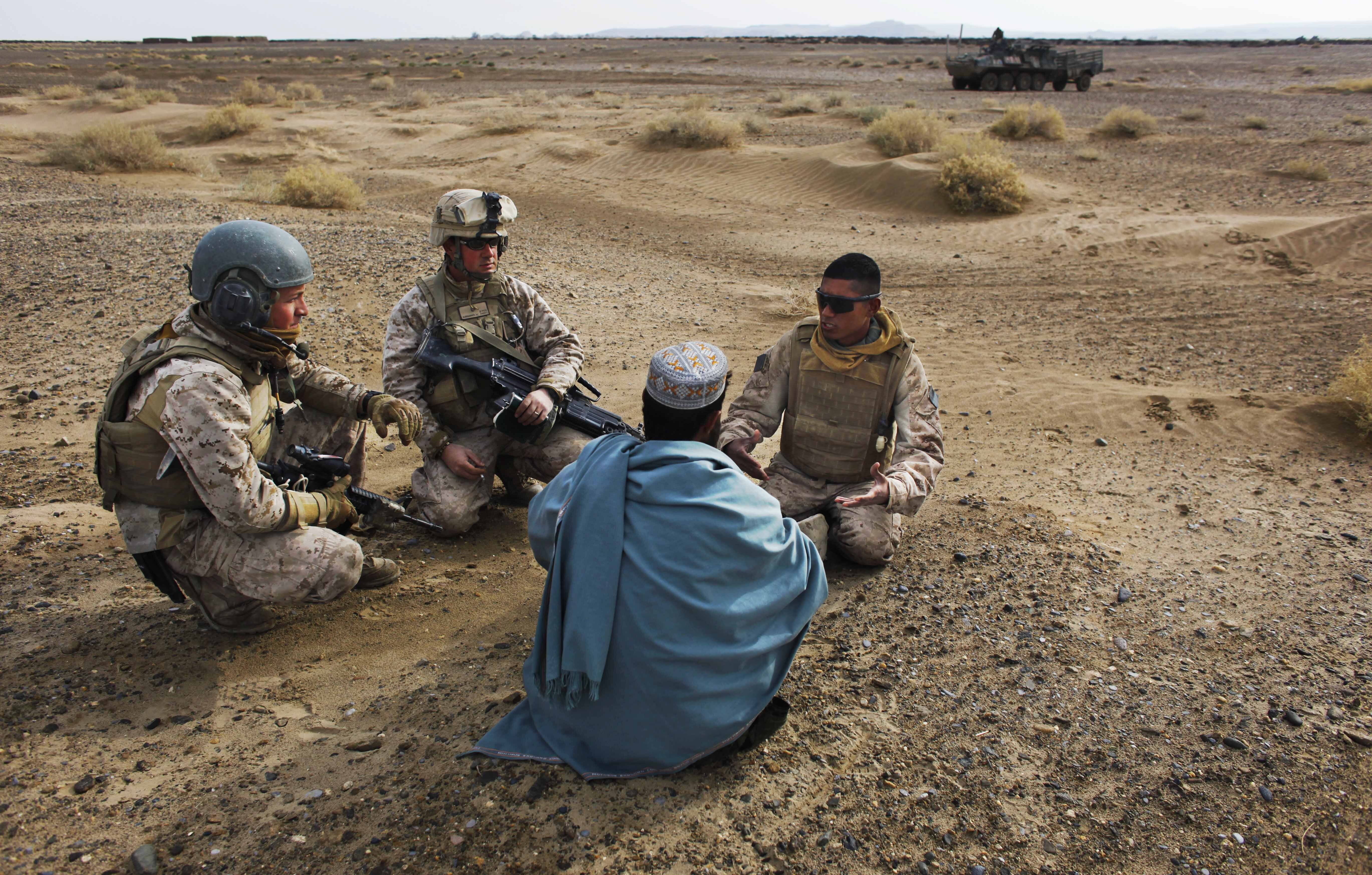United States Marines interview a local Afghan man with the help of a translator on a patrol in the volatile Helmand province of southern Afghanistan [File: Kevin Frayer/AP Photo]
