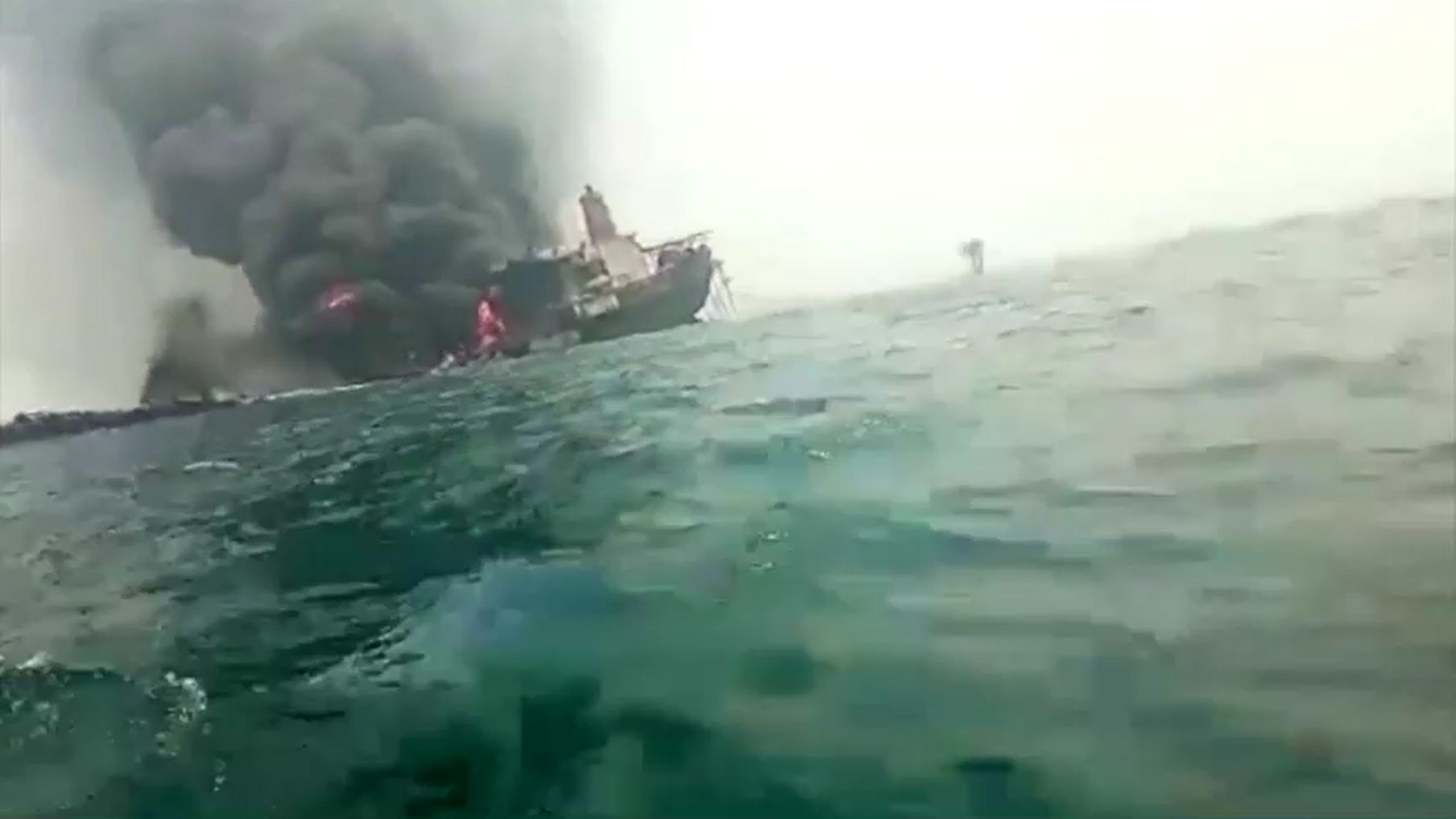 Images published by local media showed thick black smoke billowing from a sinking ship engulfed by flames.