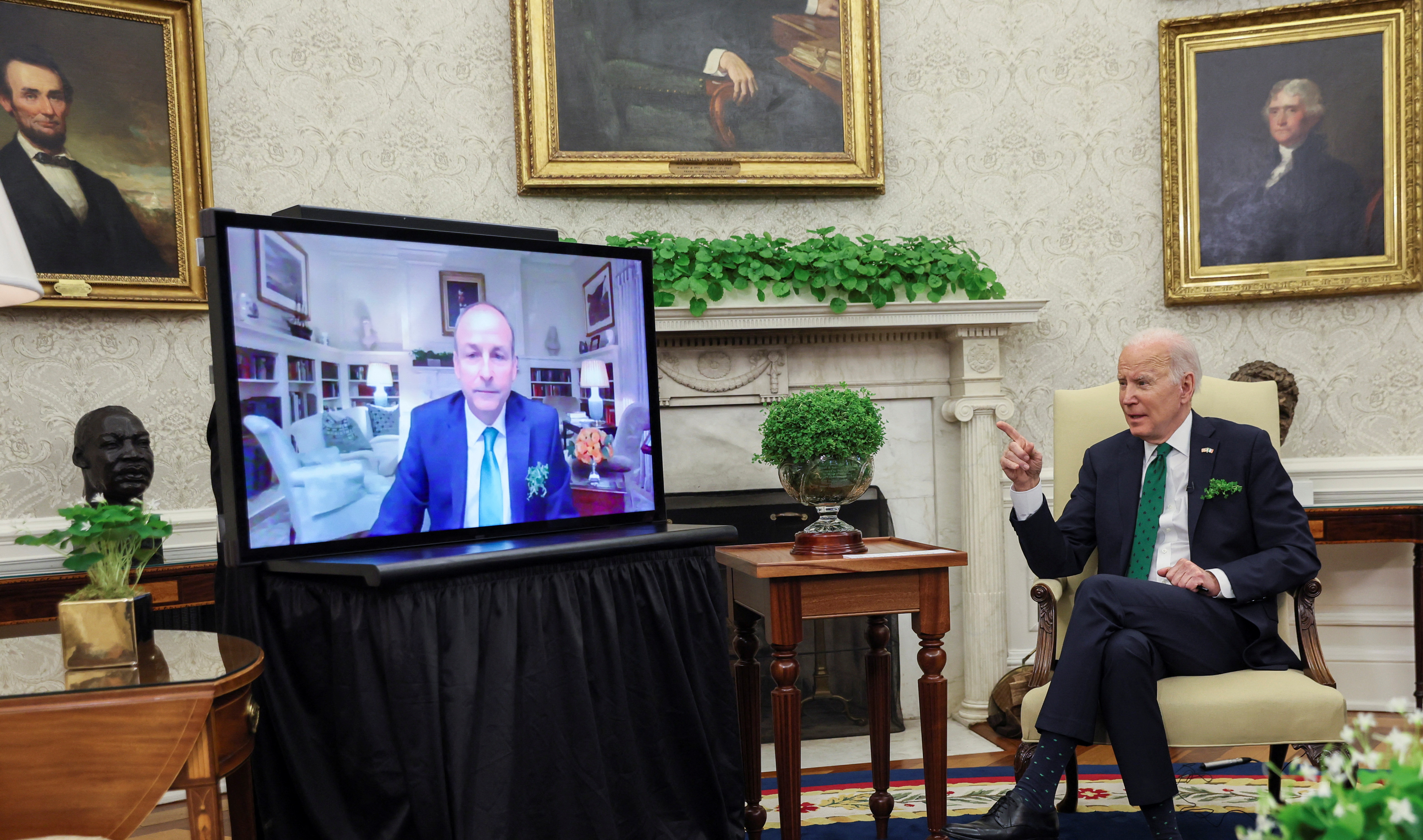 Irish prime minister’s one-on-one meeting with President Joe Biden was held by video after a positive test for COVID-19.