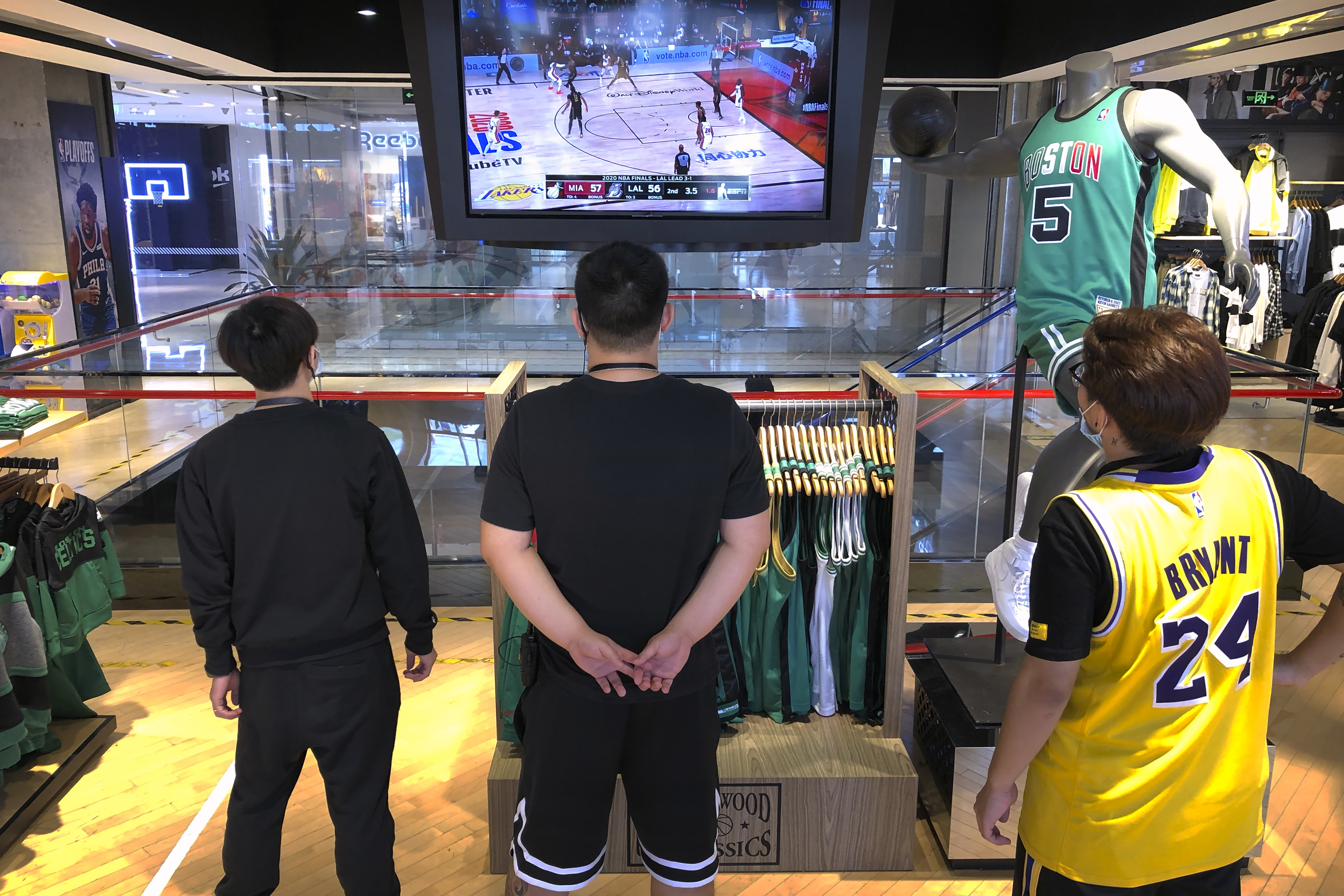 Employees watch a live broadcast of Game 5 of the NBA finals at an NBA store in Beijing [File: Mark Schiefelbein/The Associated Press]