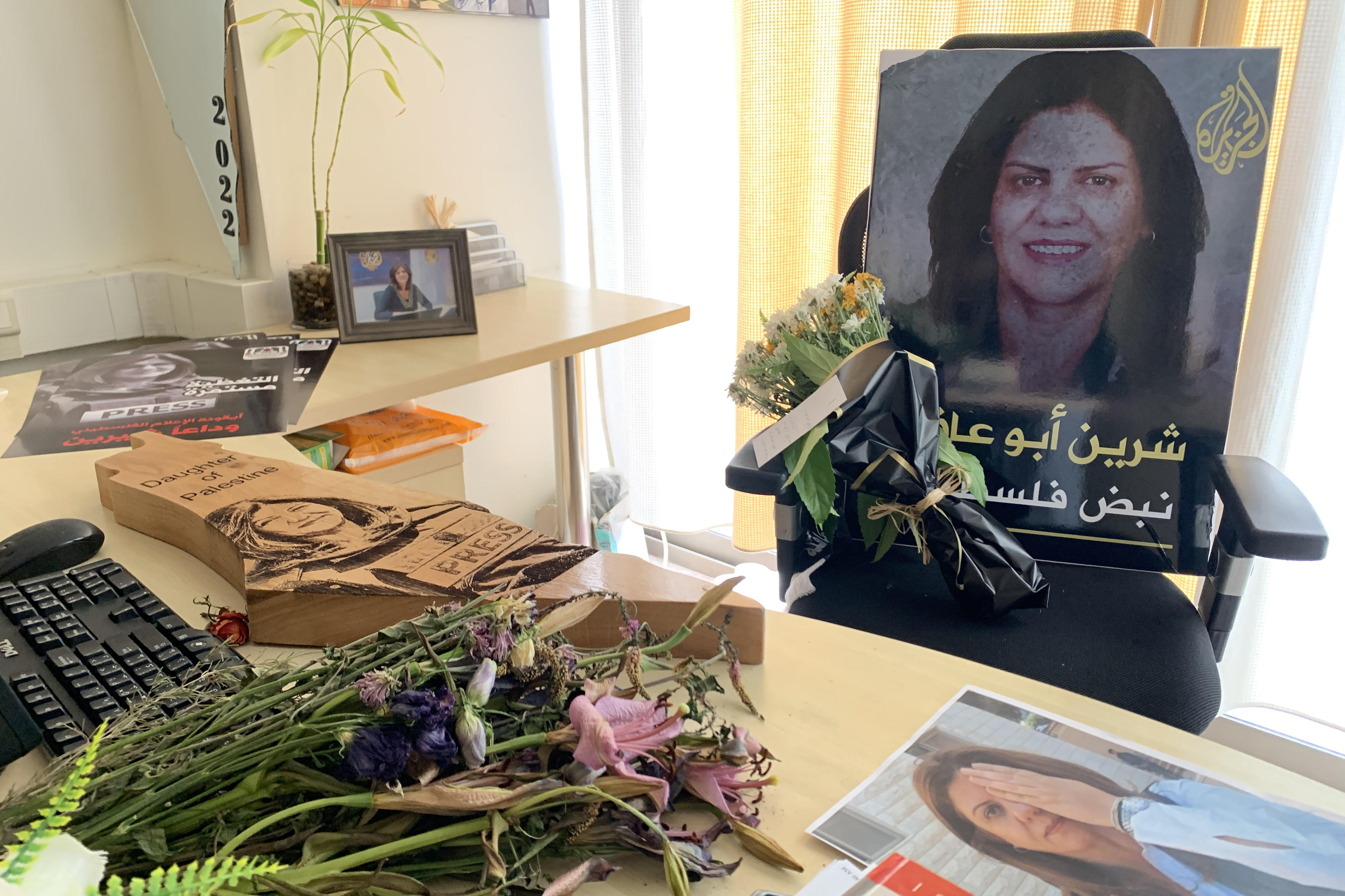 At the Al Jazeera bureau, her photos are everywhere. Abu Akleh’s office, now a little memorial, is filled with flowers, candles, and farewell notes, commemorating her long career and the legacy she left behind.