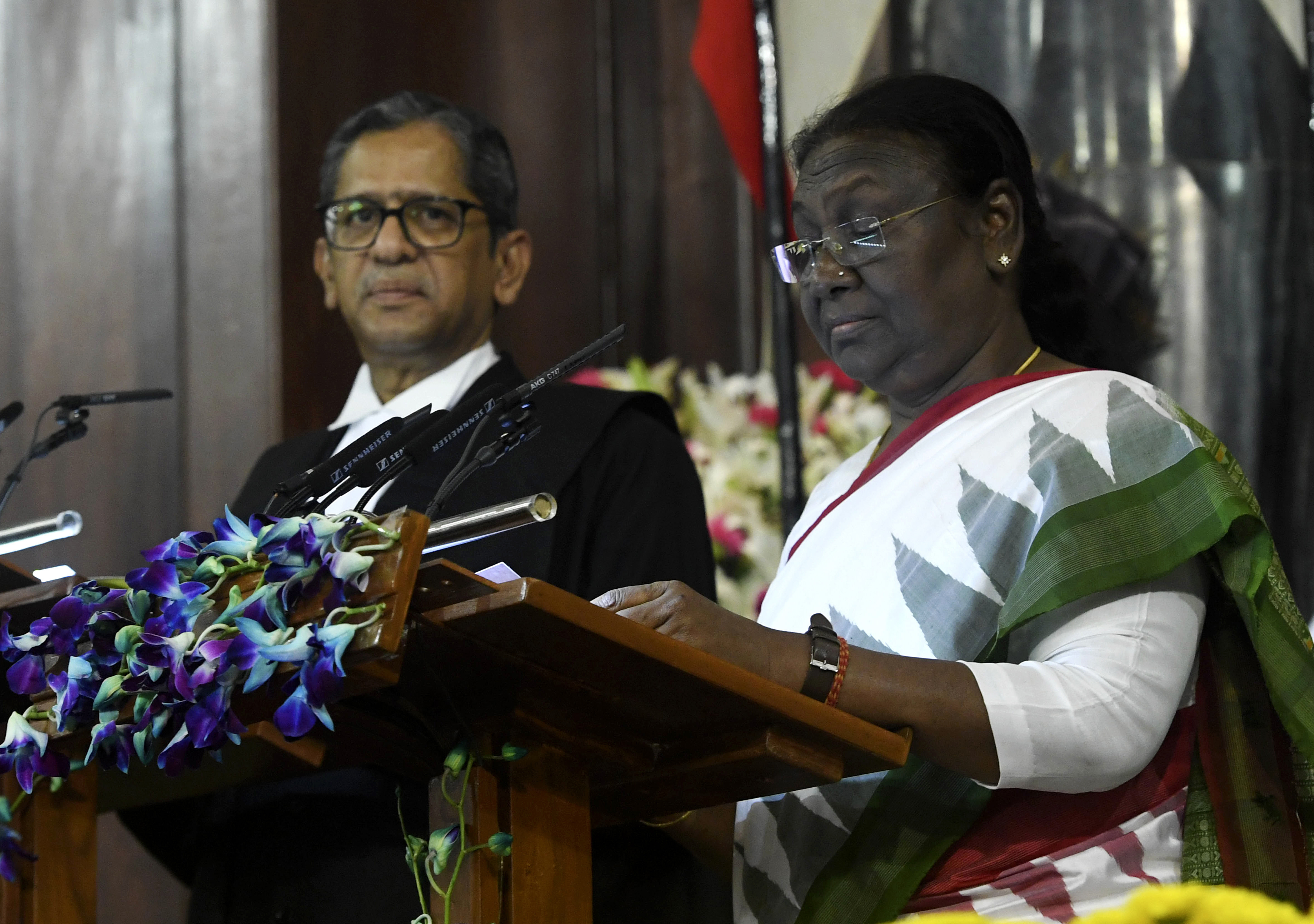 India's new president Droupadi Murmu is administered oath of office by Chief Justice of India N V Ramana, left, in New Delhi [India's Presidential Palace via AP]