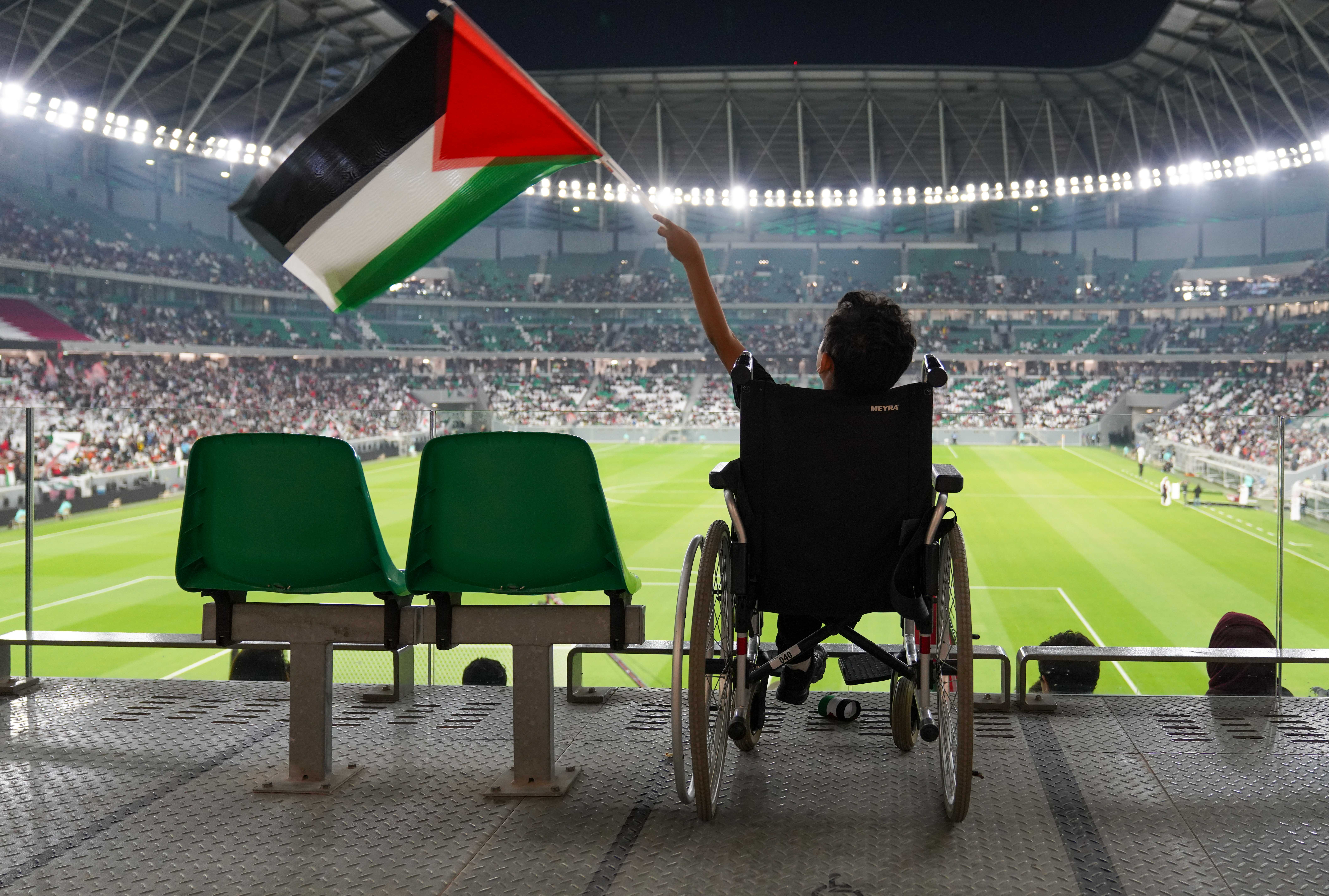 As the sun set on a windy Friday evening at the former Qatar World Cup 2022 venue on the outskirts of the capital, Doha, fans dressed in Palestinian colours and waving the Palestinian flag flocked to the venue in high spirits.
