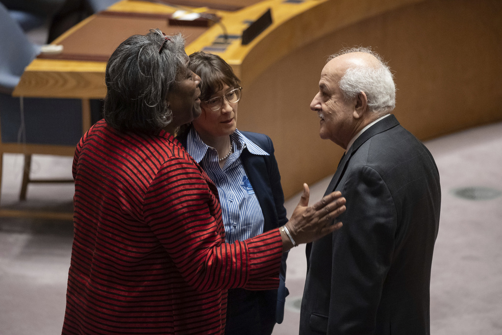 US Ambassador to the UN Linda Thomas-Greenfield, left, Palestinian Ambassador to the UN, Riyad Mansour, right, speak before the Security Council meeting at UN headquarters [Yuki Iwamura/AP]