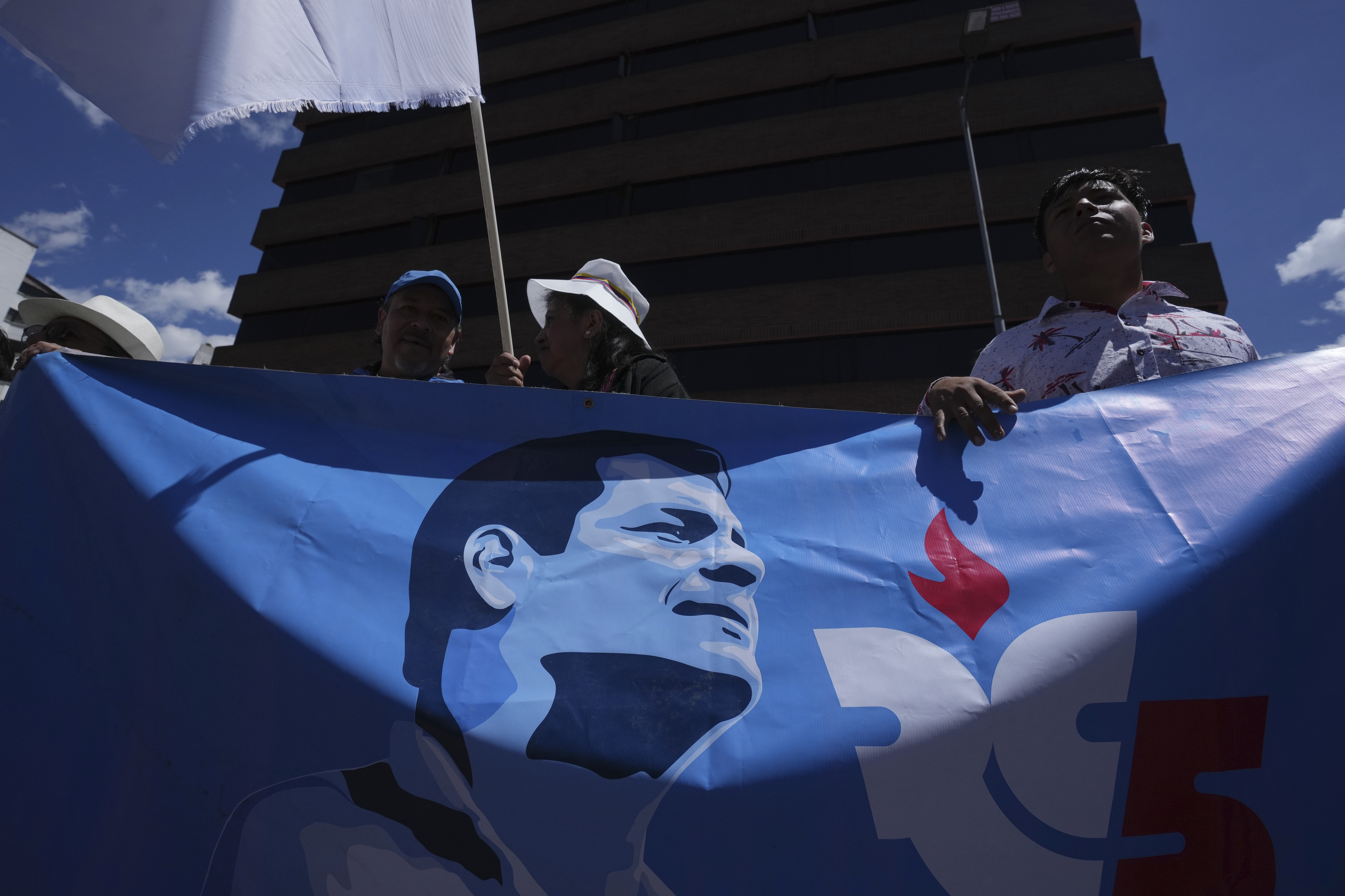 Supporters of the Citizen Revolution Movement hold a banner with an image of former President Rafael Correa as they cheer on their presidential candidate for the upcoming early elections in Quito, Ecuador [Dolores Ochoa/The Associated Press]