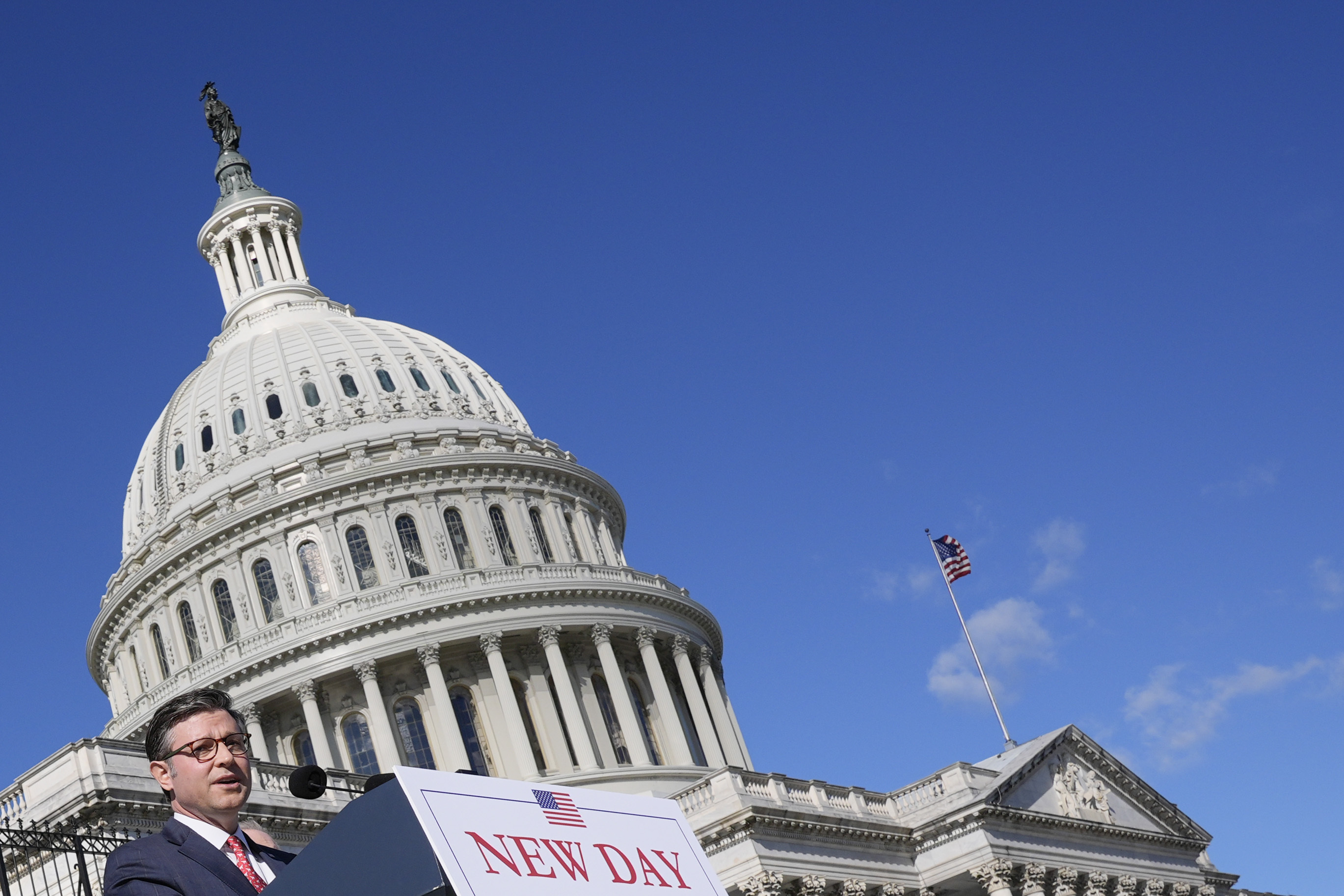 Republican Mike Johnson speaks behind a podium in front of the Capitol dome.