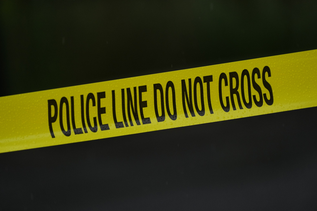 Police tape cordons off the scene.