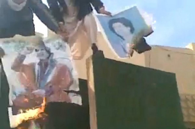 A video provided by al-Warfali of the scene in Zentan showed marchers chanting and holding a banner that read “Down with Gaddafi. Down with the regime.”