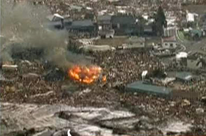 The tsunami roared over embankments in Sendai city, sweeping away cars, houses and farm equipment inland before reversing direction and carrying them out to sea. Flames shot from some of the houses, probably because of burst gas pipes.