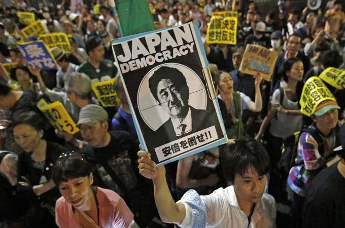 In the capital, Tokyo, people gathered in front of Abe’s official residence to protest the plan to expand its military role abroad.