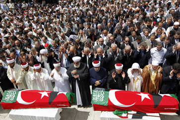 As their funerals got underway on Thursday, thousands poured onto the streets around the Fatih Mosque in Istanbul, chanting slogans condemning Israel and waving Turkish and Palestinian flags.