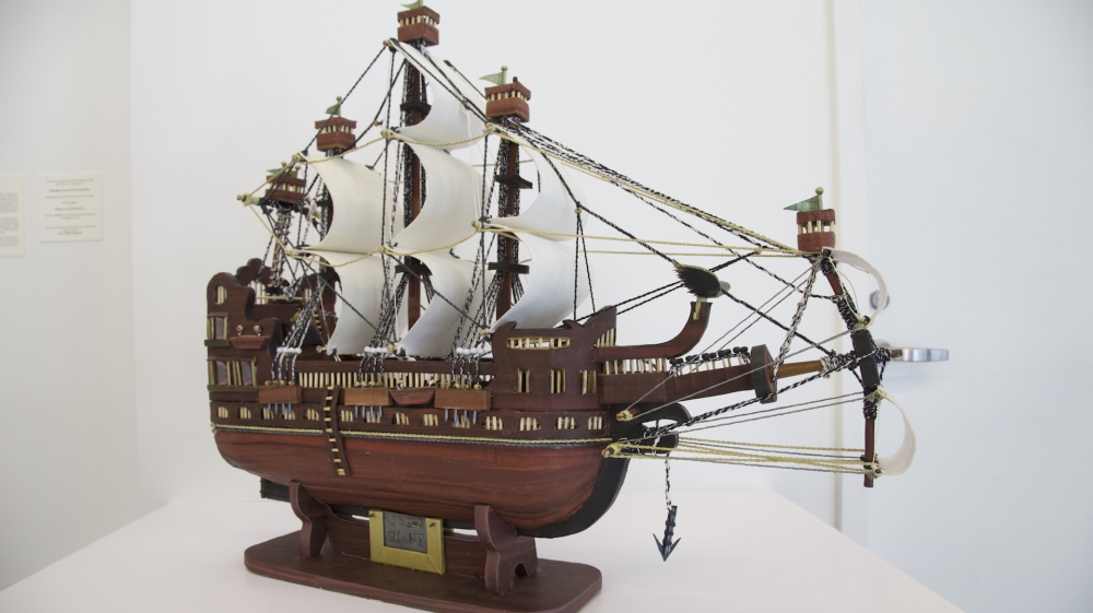 The first object that greets visitors of the exhibition is an intricate model sailing vessel, replete with billowing sails, several masts and viewing turrets. Its massive body is on the way somewhere, directed and fully absorbed in meeting its goal. The winds, too, have blessed its journey: each square of sail is stretched to its full convex potential, moving the vessel forward. When we get closer and peer into the plexiglass box holding this ship captive, we see some other, curious details: a ship’s wheel, in gold, and a little black anchor hanging incongruously from the vessel.