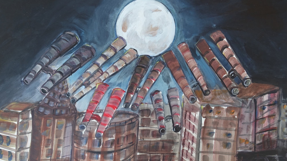 In “Untitled (Binoculars Pointing at the Moon)”, Ahmed Rabbani depicts massive, tubular telescopes, projected from the tops of multi-storey buildings towards an enormous, luminous moon. It mimics the way in which Rabbani experienced how he, along with the whole world, anticipated a supermoon that “was at its closest point to earth since 70 years”, he says.
