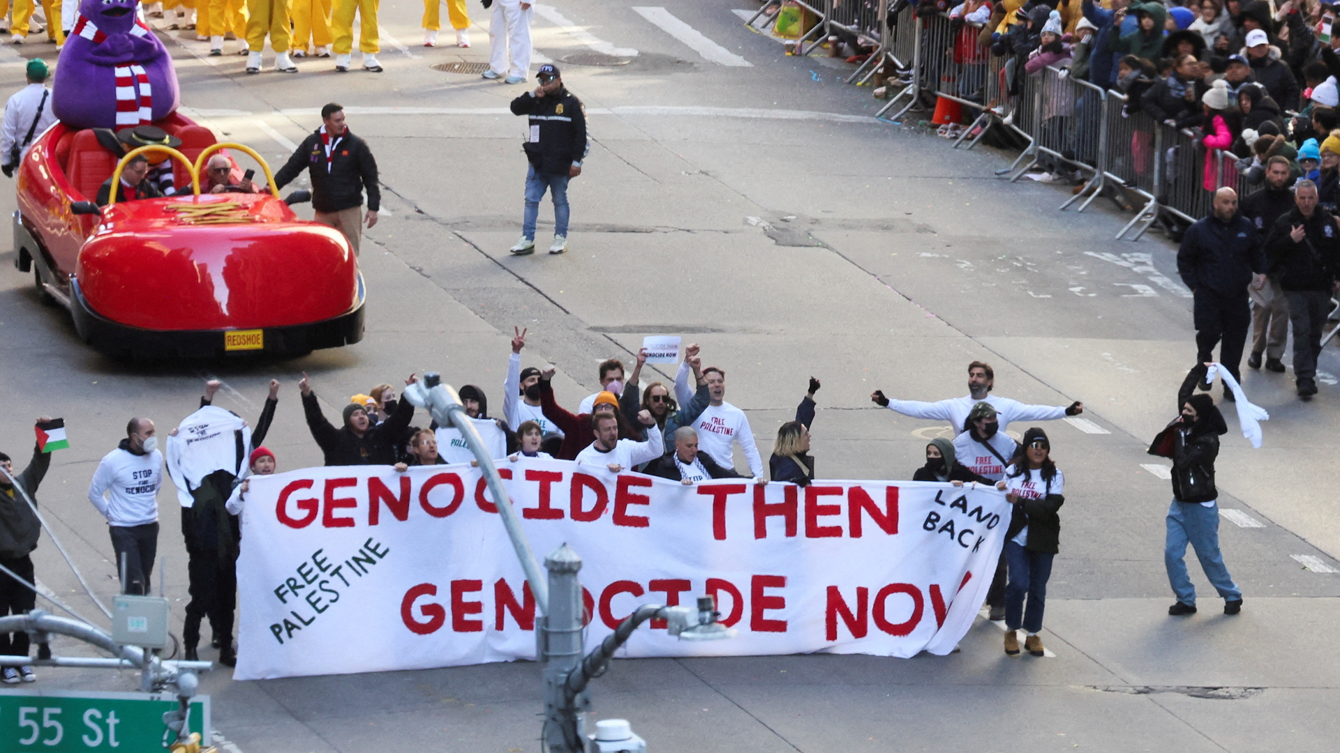 Pro-Palestine demonstrators glued their hands to the street in the middle of the annual Macy’s Thanksgiving Day Parade in New York City, temporarily halting the event. There were other instances of protests on the sidelines as well.