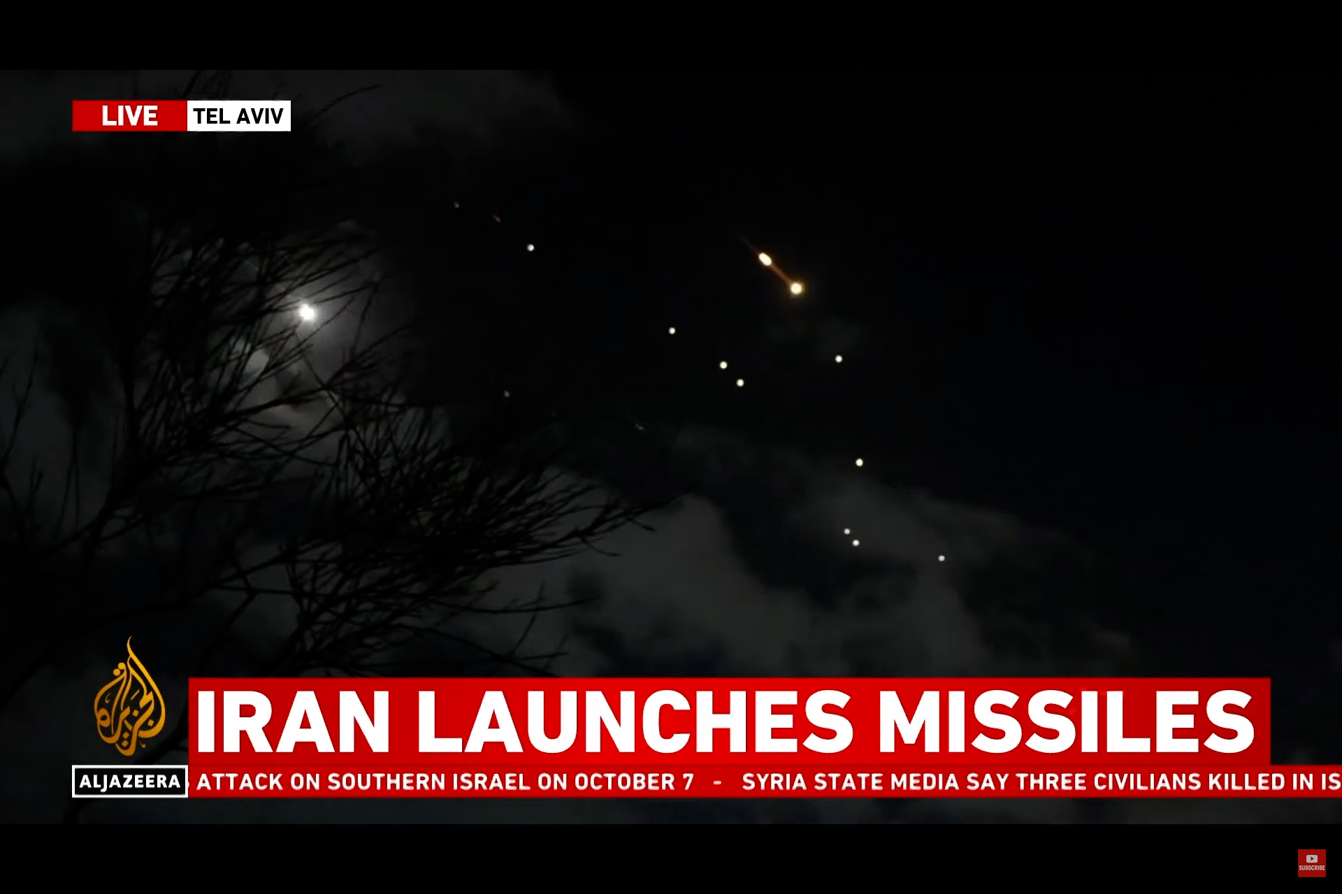 Live video from Tel Aviv showed a barrage of projectiles that the Israeli military says were Iranian missiles after warnings of an imminent attack.
