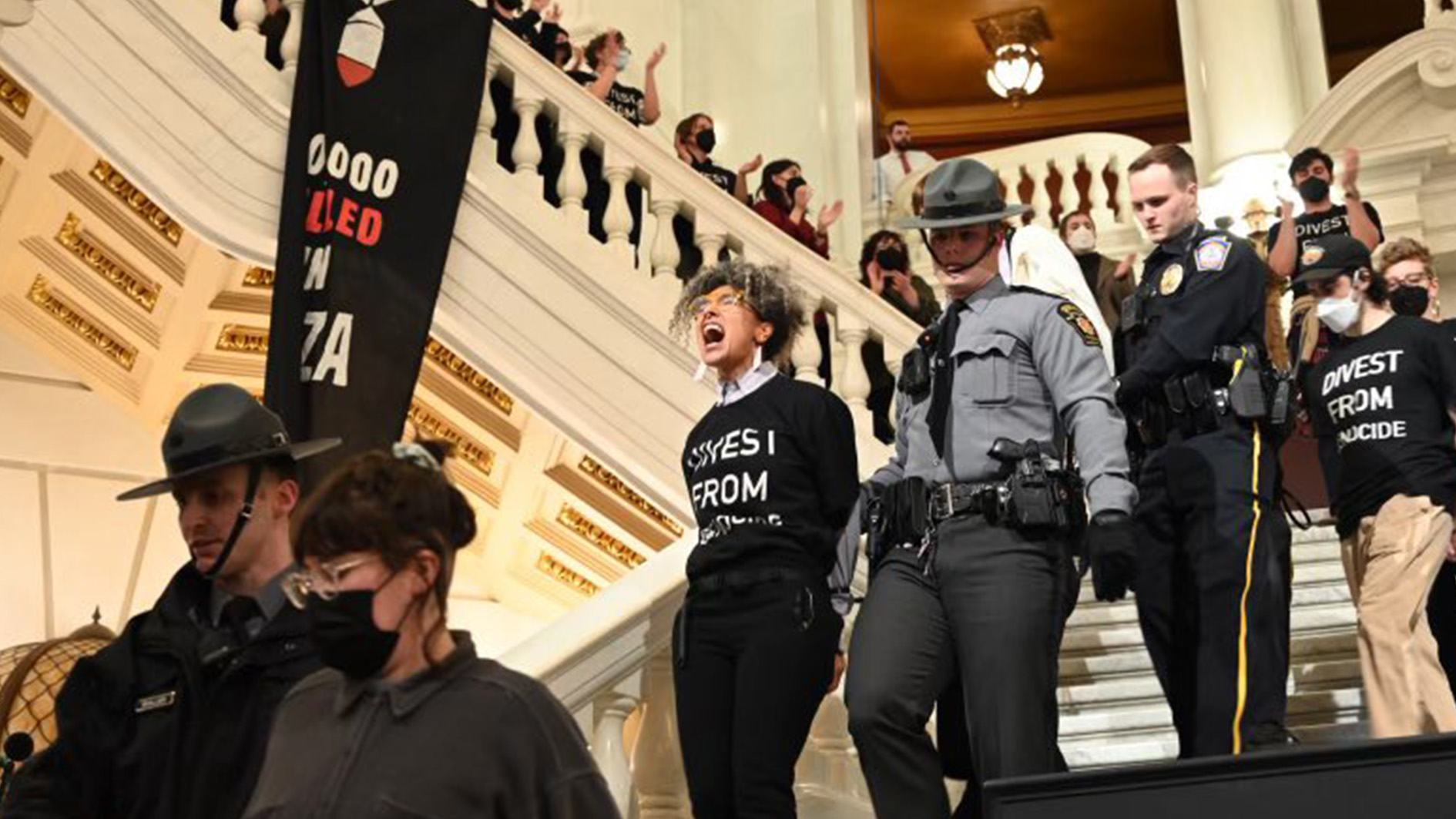 A coalition of pro-Palestine activists, including Jewish Voice for Peace, staged a protest inside Pennsylvania’s state capitol building calling for an ‘end to genocide’ in Gaza and for the state to stop investing in Israeli companies. More than 100 people were reportedly arrested.