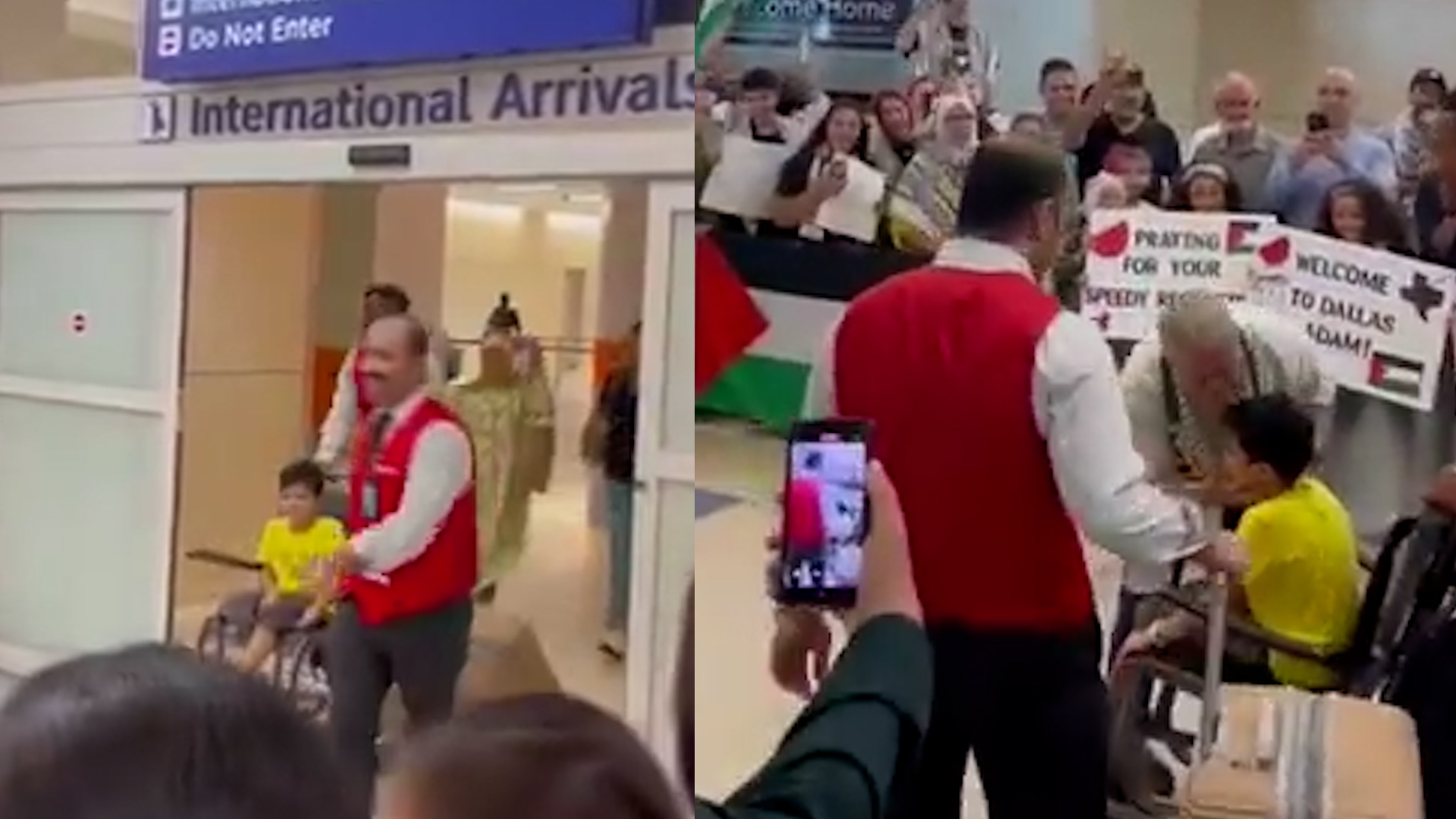 Eight-year-old Palestinian boy, Adam, was greeted by a cheering crowd as he arrived in Dallas, Texas for medical treatment. The child reportedly lost his leg in an Israeli drone attack on his home in Gaza.