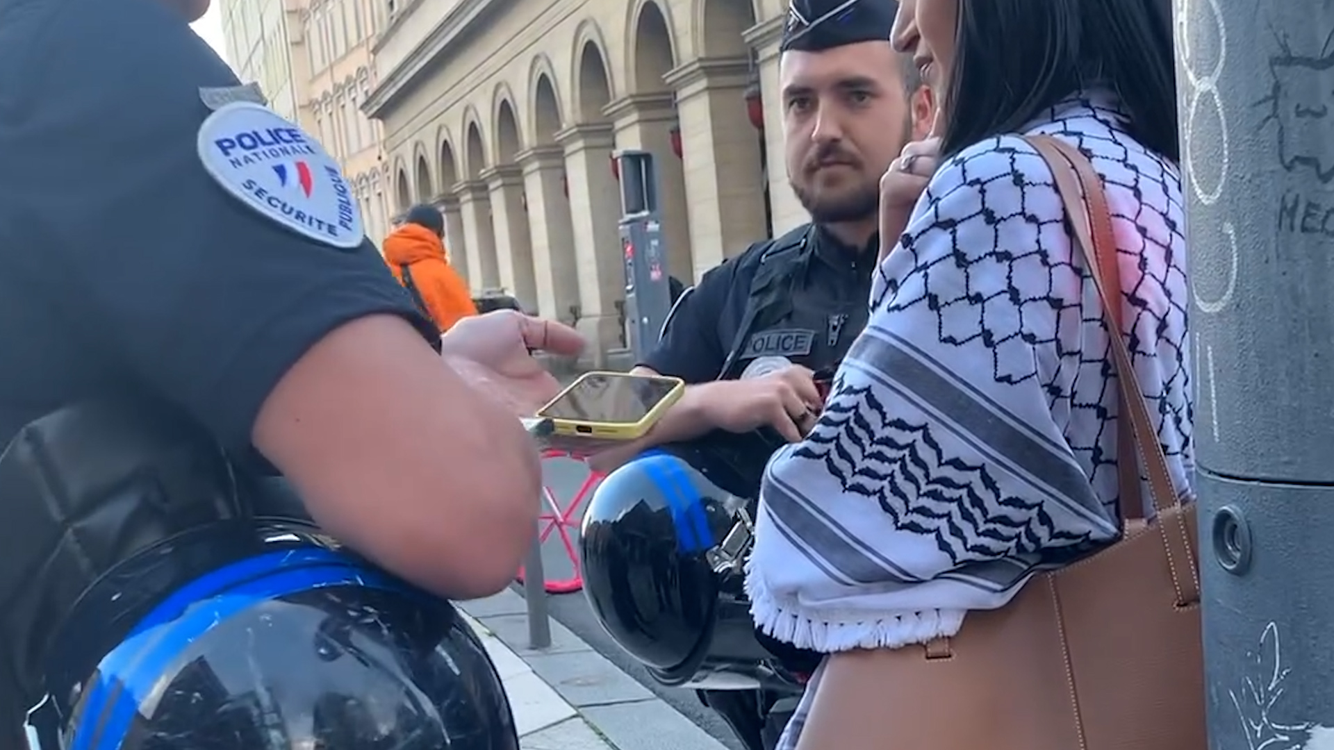Watch the moment police detained and fined a woman wearing a traditional Palestinian scarf known as a keffiyeh, accusing her of being part of an illegal protest in Lyon.