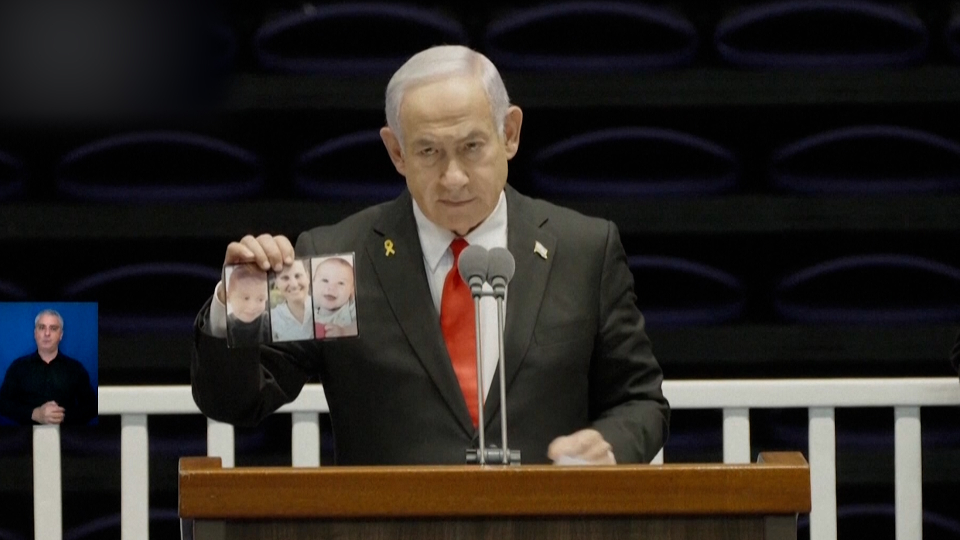 Netanyahu heckled while showing photos of Bibas family